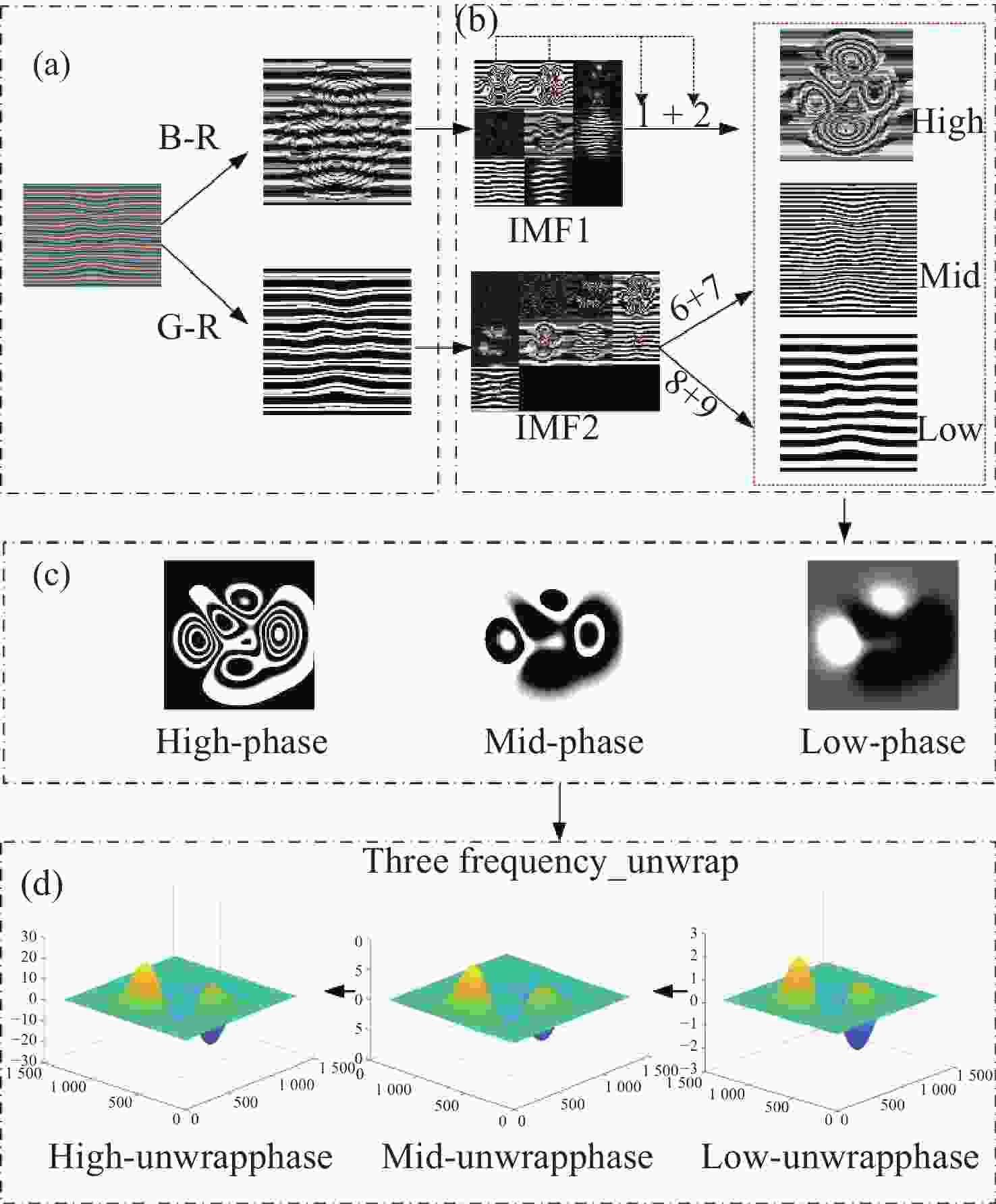 图 2 本文方法peak仿真实验步骤。(a)通道互减消除背景;(b)获得高、中、低频分量;(c)对高、中、低频分量提取相位;(d)获得低、中、高频展开相位