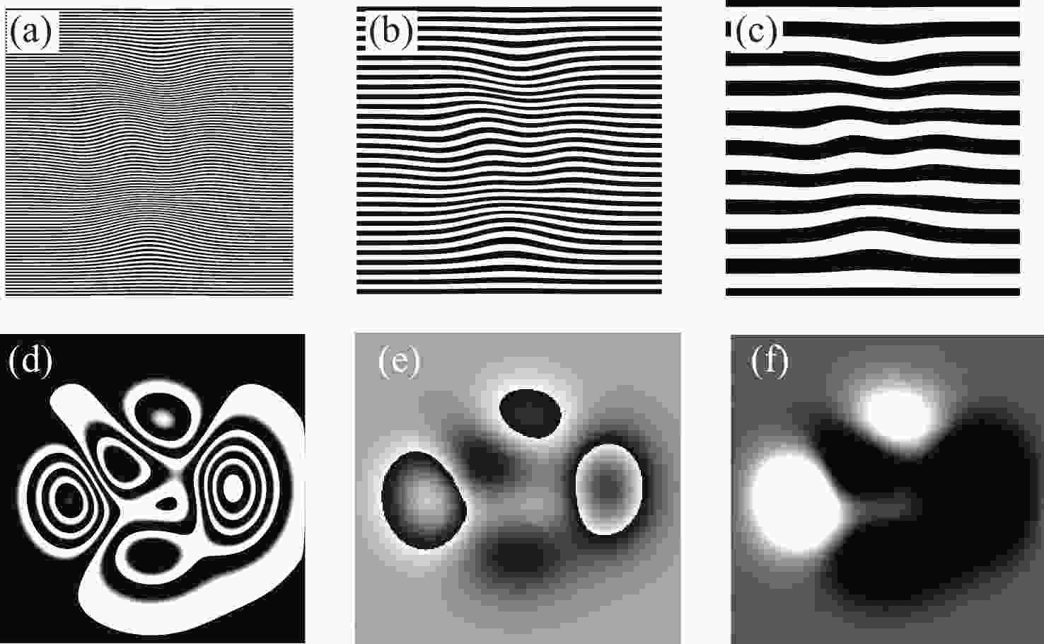 图 11 彩色条纹图初始RGB通道和快速迭代滤波分解后的RGB通道图像。(a) 初始高频通道;(b) 初始中频通道;(c) 初始低频通道;(d) fpFIF2分解后的高频通道、 (e)中频通道及(f)低频通道