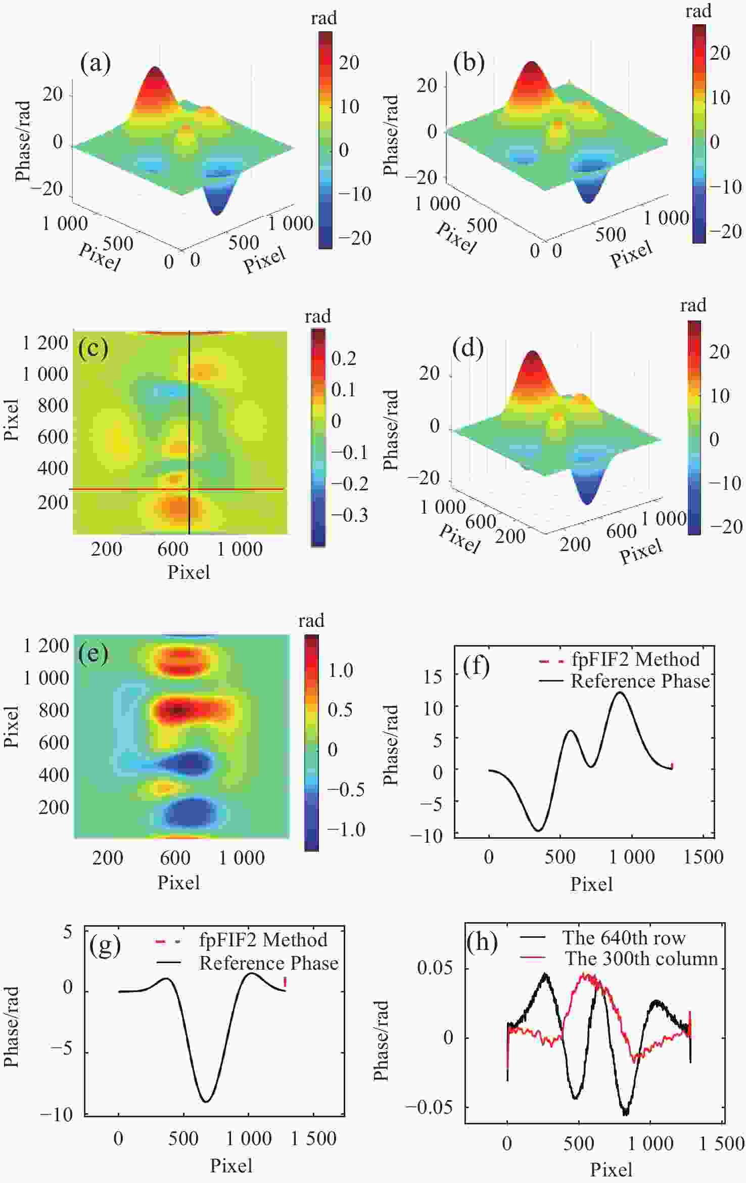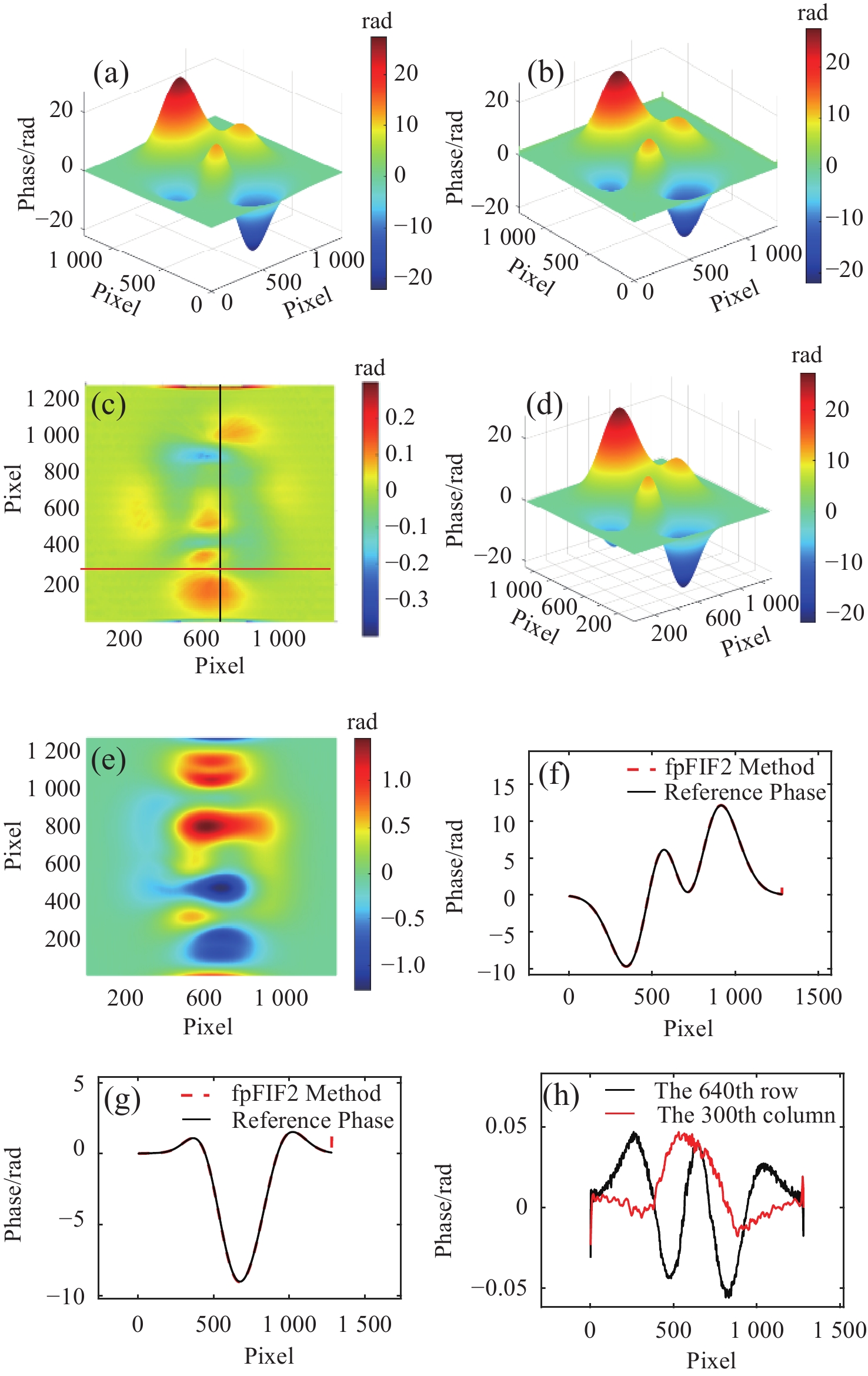 Figure 4. Comparison of the unwrapped phase and reference phase solutions obtained by the proposed method and the FTP method. (a) Reference phase; (b) expanded phase of the method in this paper; (c) phase error map of the method in this paper; (d) expanded phase using the traditional Fourier method; (e) phase error map of the traditional Fourier method; comparison of the reference phase and the expanded phase obtained by the method in this paper for (f) the phase data of the 640th row and (g) the phase data of the 300th column, and (h) the error of the 640th row and the 300th column