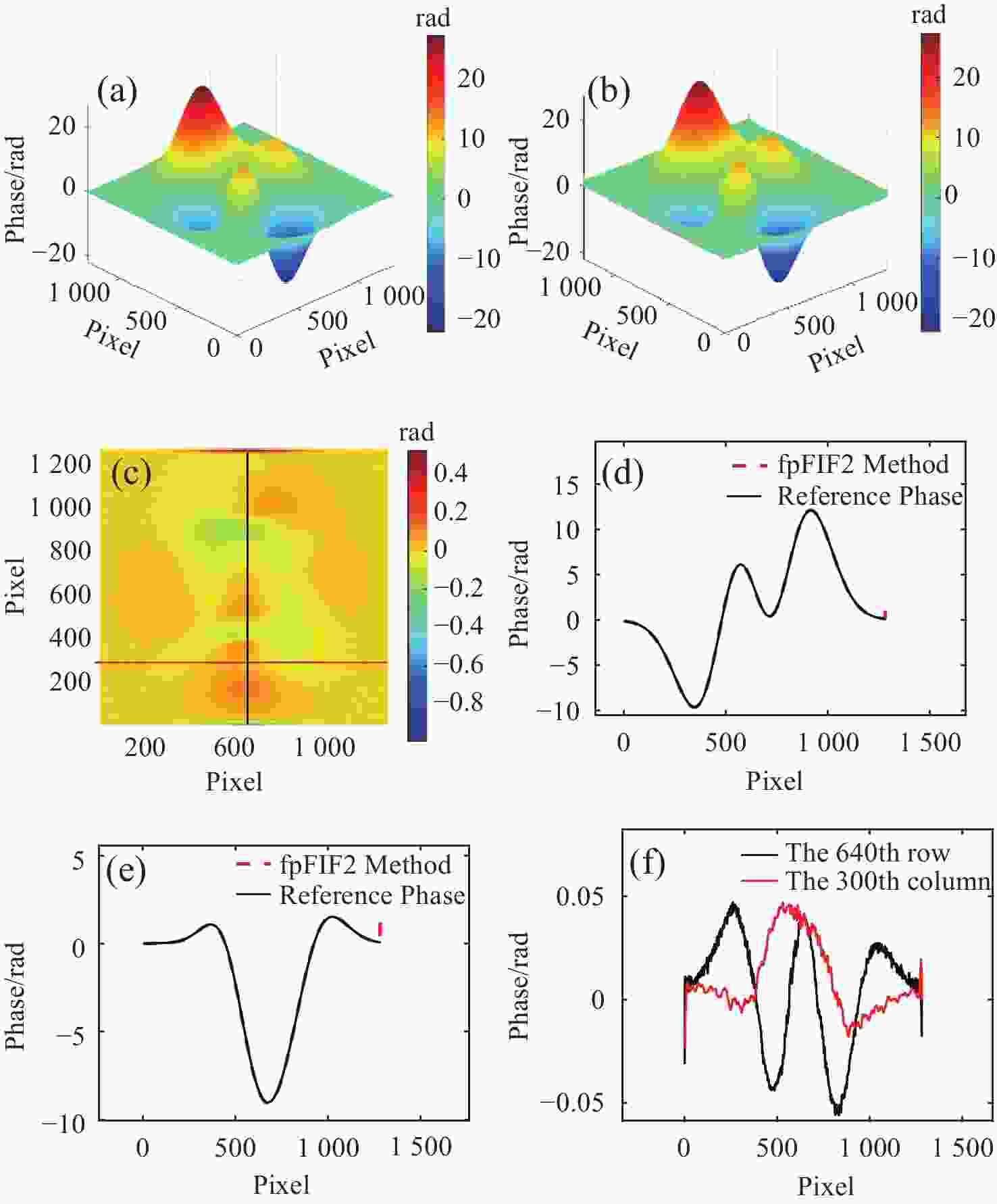 图 5 增大颜色耦合和噪声后(接近真实实验环境)参考相位和真实相位对比。(a) 参考相位;(b) 真实相位;(c) 参考相位与真实相位误差图;(d) 参考相位与真实相位第640行展开相位数据、(e)第300列展开相位数据及(f)第640行与第300列误差