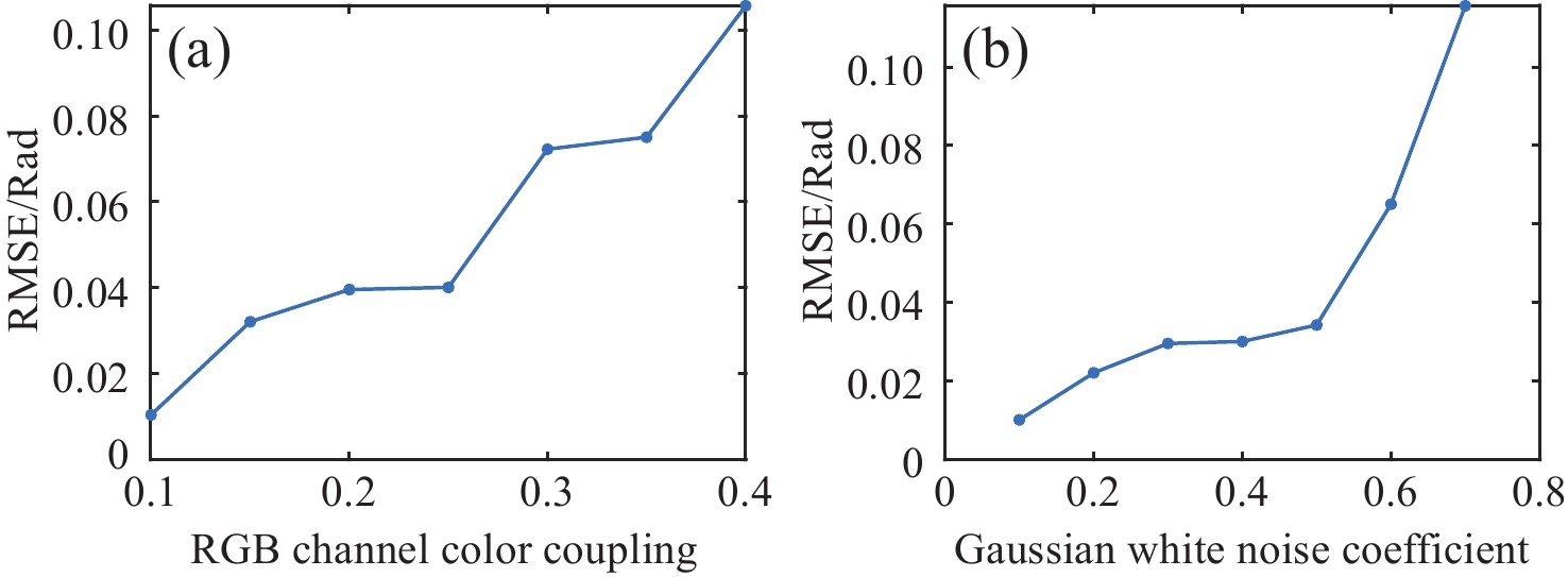 Figure 6. The impact of color coupling coefficients and noise in RGB channels on Root Mean Square Error (RMSE). (a) Variation curves of color coupling coefficient of RGB versus RMSE under a Gaussian white noise of 0.4 (close to real environmental noise); (b) the influence of Gaussian white noise on RMSE under the same color coupling coefficient as in Fig. 4