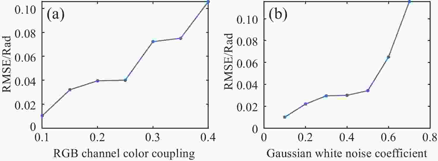 图 6 RGB通道的颜色耦合系数和噪声对均方根误差的影响。(a) 高斯白噪声系数为0.4(与真实环境噪声接近)时RGB通道的颜色耦合系数与均方根误差的变化曲线图;(b) 高斯白噪声强度对均方根误差的影响