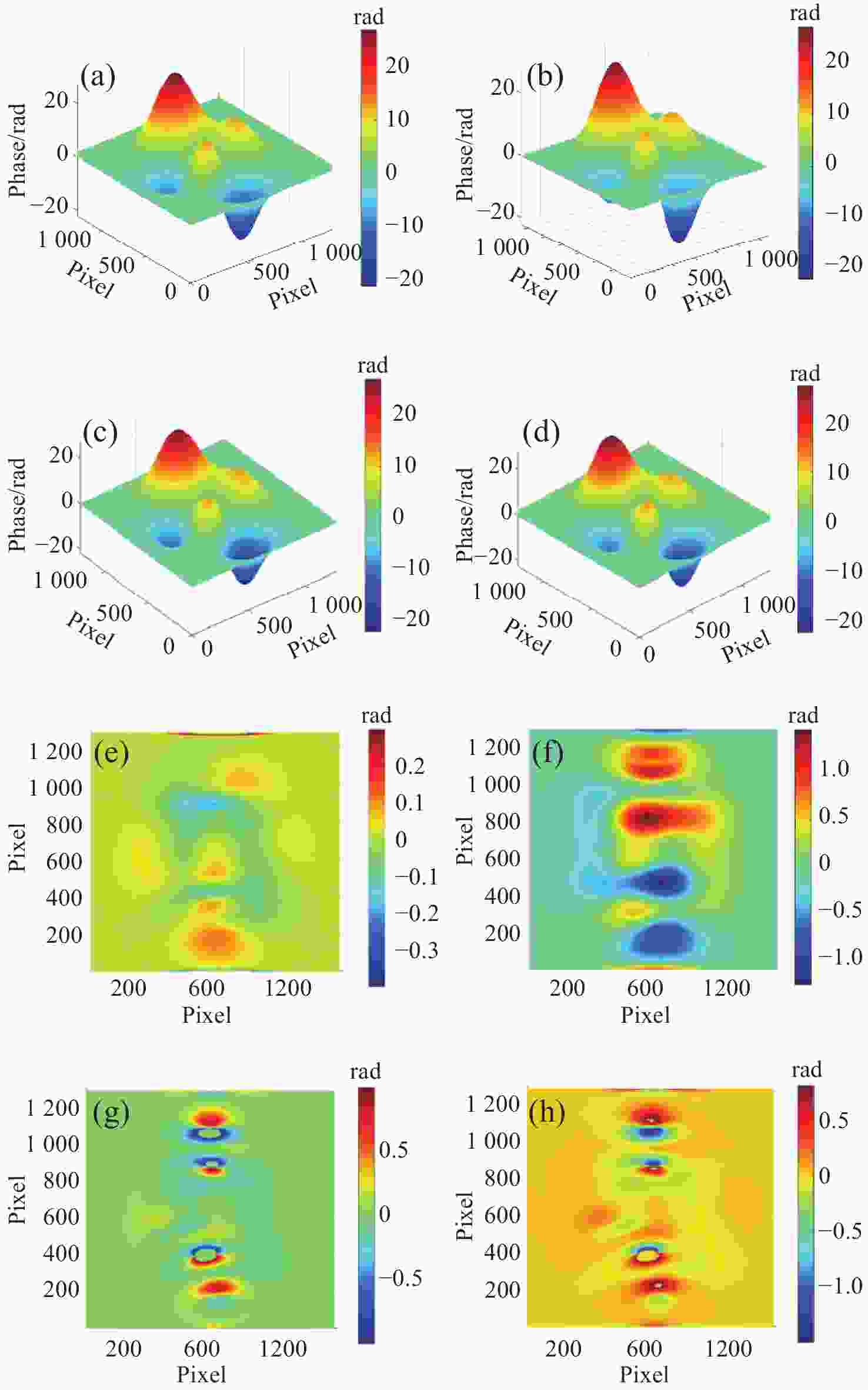 Figure 7. Comparison of simulation experiment accuracy among different methods. Unwrapped phase obtained by (a) the method in this paper, (b) FTP method, (c) VID method, and (d) the BEMD method; error maps between the unwrapped phases and the reference phase for (e) the method in this paper, (f) FTP method, (g) VID method, and (h) the BEMD method