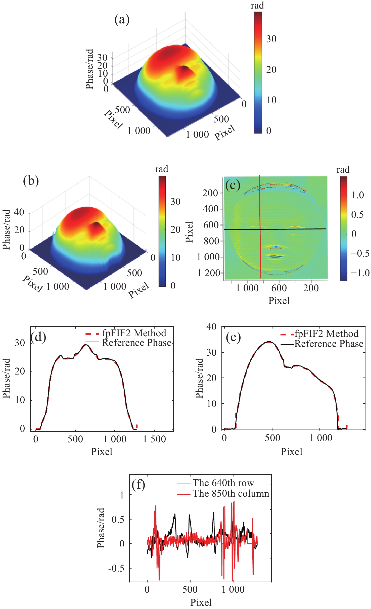 Figure 9. Comparison of reference phase and real phase. (a) Reference phase; (b) real phase; (c) error map between reference phase and real phase; data from (d) the 640th row, (e) the 850th column of real phase and reference phase; (f) error between the 640th row and the 850th column