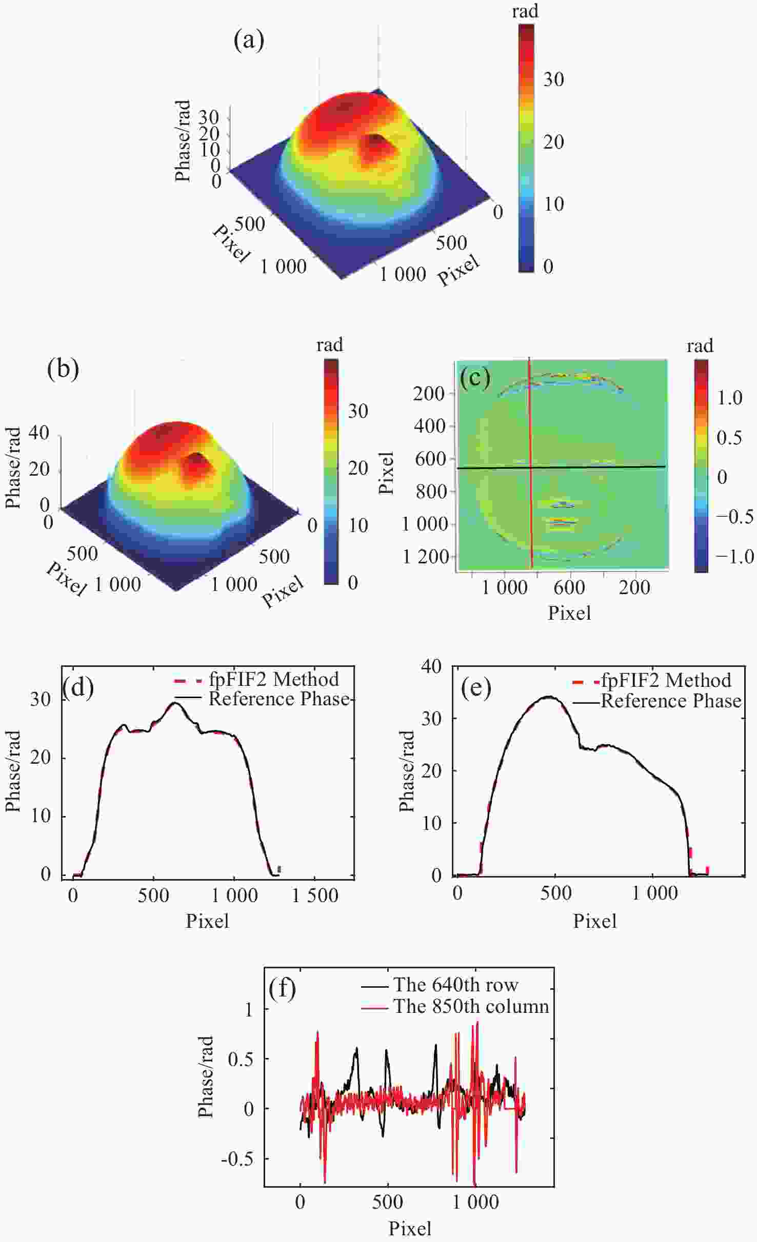 图 9 参考相位和真实相位对比。(a) 参考相位;(b) 真实相位;(c) 参考相位与真实相位误差图;(d) 真实相位与参考相位第640行数据、(e)第850列数据、(f)第640行和第850列误差