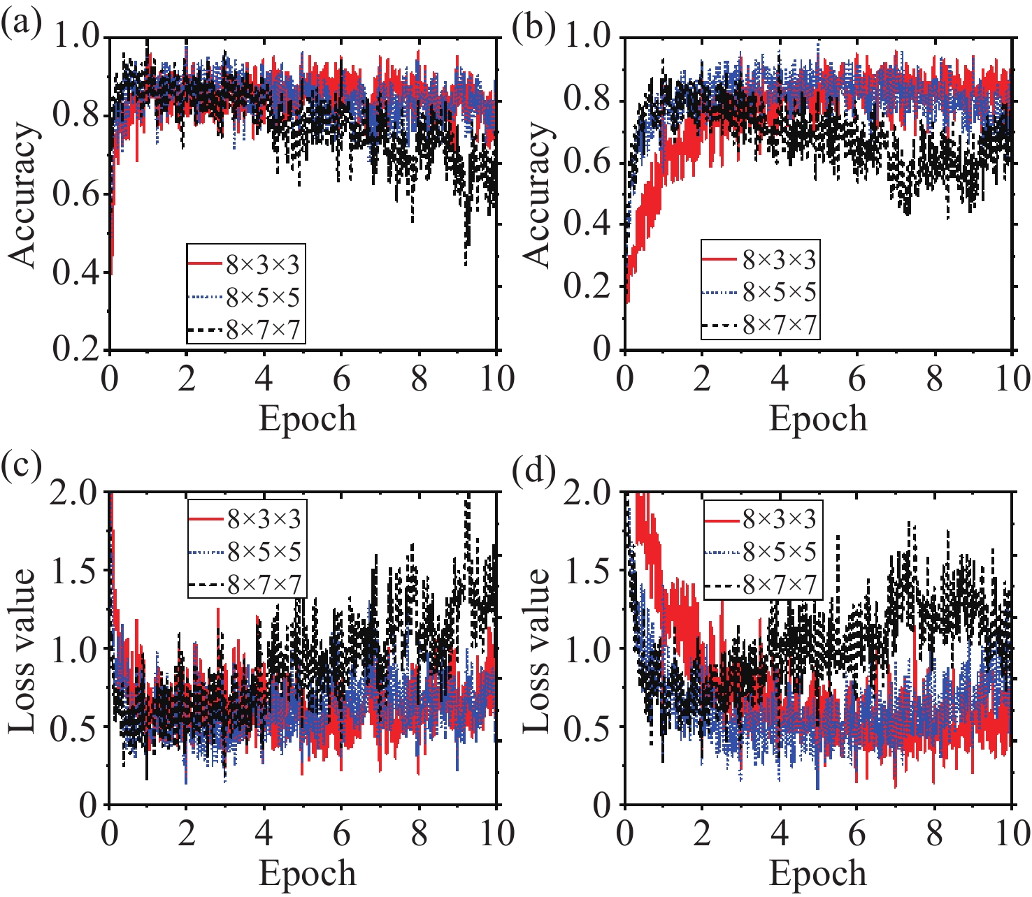 (等宽填充)8×3×3 28×28×1 28×28×8 池化层 N×N 28×28×8 $ \dfrac{{28}}{N} \times \dfrac{{28}}{N} \times 8 $ 全连接层 $ \dfrac{{28}}{N} \times \dfrac{{28}}{N} \times 8 $ $ \dfrac{{28}}{N} \times \dfrac{{28}}{N} \times 8 $ 10 表 2 采用不同池化方式和不同尺寸的OCNN的识别准确率