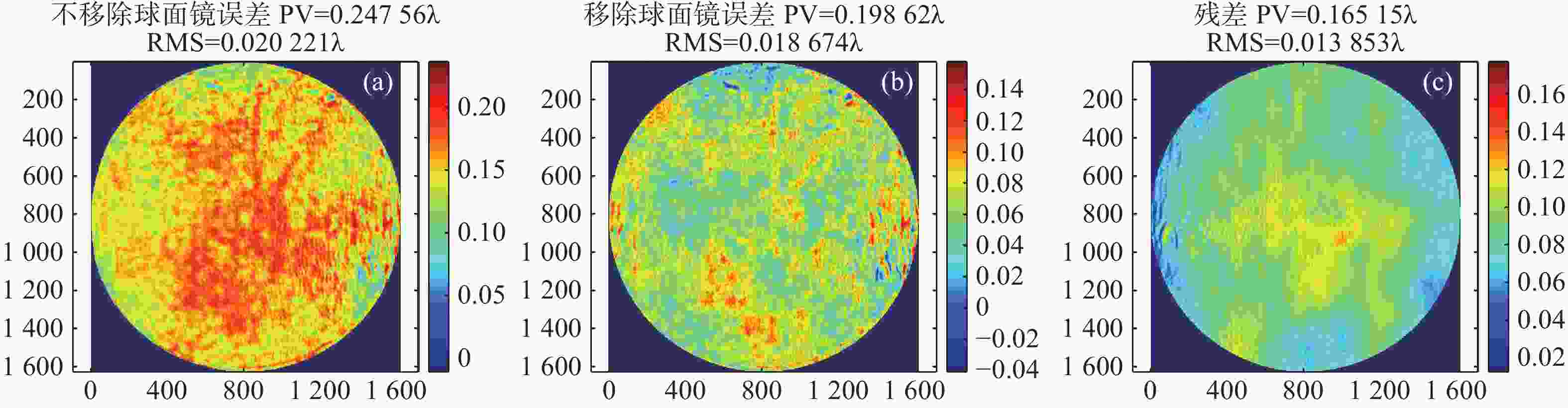 图 11 去除球面镜面形误差前后的数据处理结果对比。(a)未移除球面镜误差面形;(b) 移除球面镜误差后面形;(c)去除球面镜面形误差前后残差