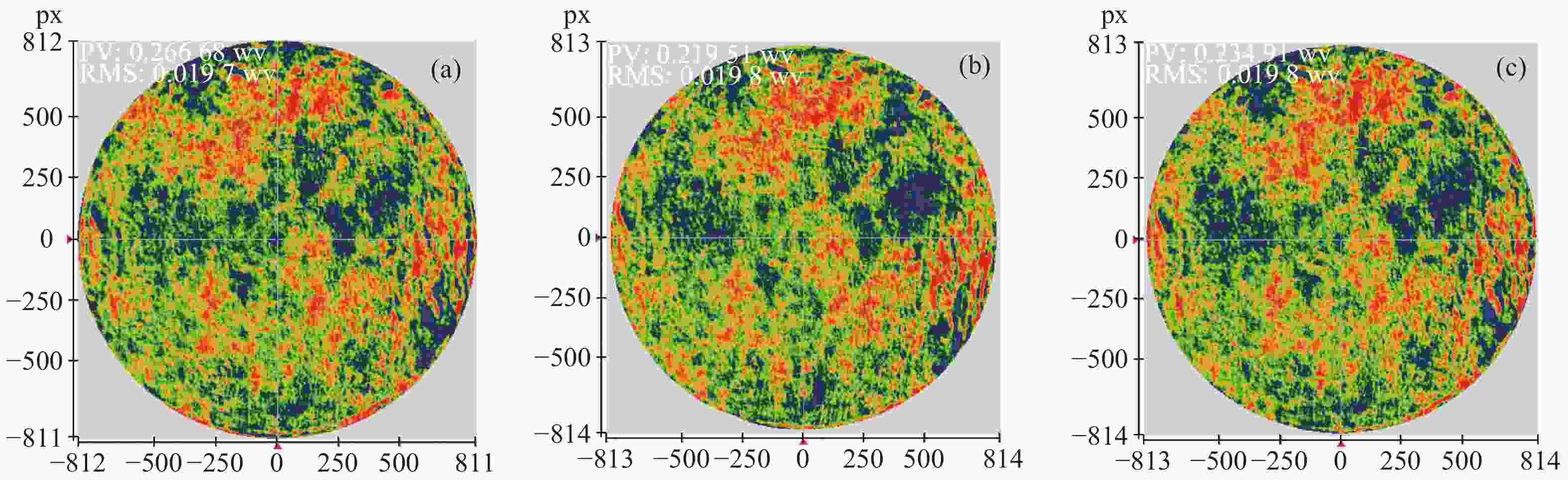 unit: λ θ1 = 41° θ2 = 45° Calculation results Residual error (1) PV= 0.2036 RMS=0.0229 PV= 0.3406 RMS=0.0259 PV= 0.4060 RMS=0.0159 PV= 0.0986 RMS=0.0067 (2) PV= 0.1878 RMS=0.0205 PV= 0.3429 RMS=0.0265 PV= 0.4700 RMS=0.0158 PV= 0.0979 RMS=0.0066 (3) PV= 0.2037 RMS=0.0201 PV= 0.3220 RMS=0.0257 PV= 0.4460 RMS=0.0160 PV= 0.0986 RMS=0.0067 表 2 平面镜面形检测结果
