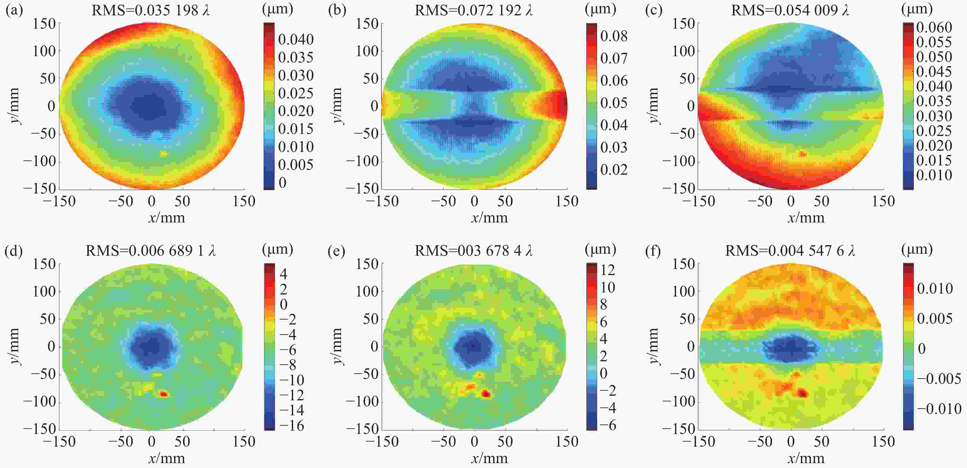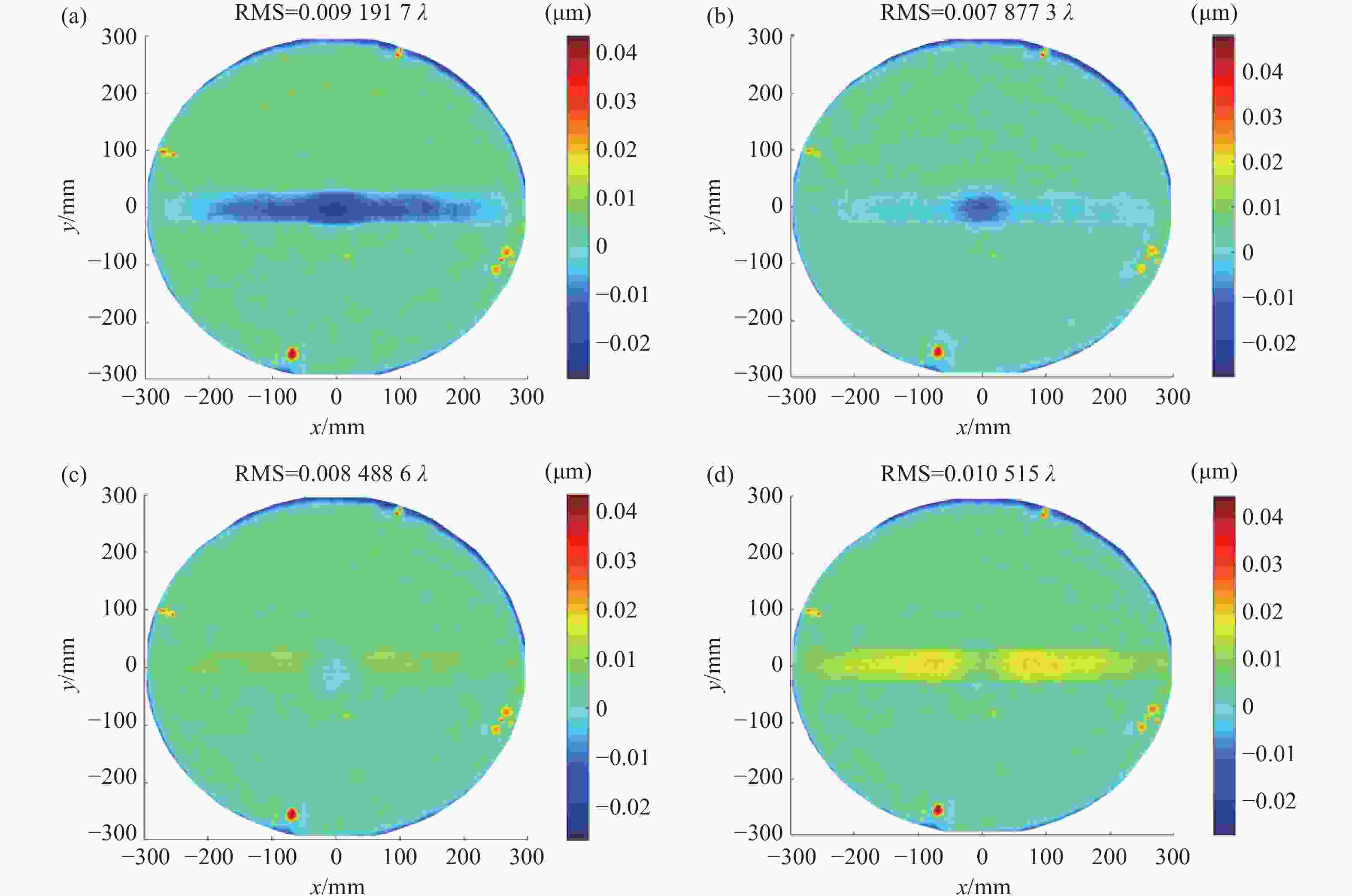 λ (λ =632.8 nm),RMS为1.788λ 的元件面形收敛至PV=4.873λ ,RMS=1.113λ ,与此同时,其直径120 mm的有效区间内PV=4.661λ ,RMS=0.857λ ,经加工后收敛至PV=2.465λ ,RMS=0.622λ ,总执行时间为3.943 h。若采用协同加工策略,单个加工单元最长执行时间为2.041 h,相比单工具效率提升1.93倍。与单机器人加工相比,该方法使得加工效率显著提高,面形精度得到保证,有效缩短了加工周期,在大孔径光学元件制造中具有很强的适用性和潜力,同时也为未来使用更多机器人的协同光学制造提供了轨迹规划策略参考。-