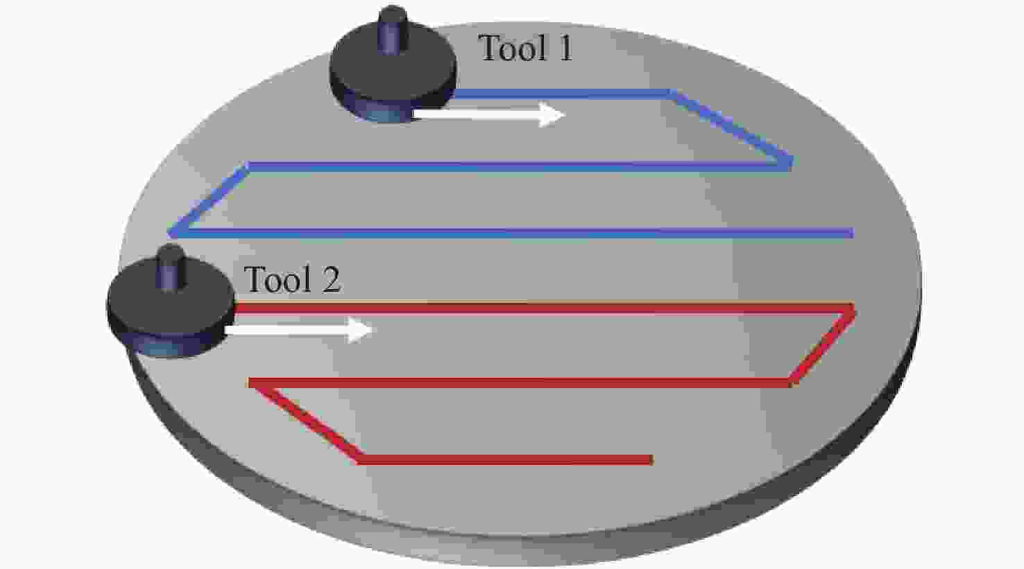 λ (λ =632.8 nm) and RMS=1.788λ , the final surface achieved PV=4.873λ and RMS=1.113λ . In addition, within the effective range of 120 mm diameter, PV=4.661λ and RMS=0.857λ converged to PV=2.465λ and RMS=0.622λ after processing. The total execution time was 3.943 h, with the maximum execution time for a single processing unit being 2.041 h, representing a 1.93-fold improvement over single-tool processing. This method significantly enhances processing efficiency, ensures surface shape accuracy, and holds great potential for the manufacturing of large-aperture optical components. -