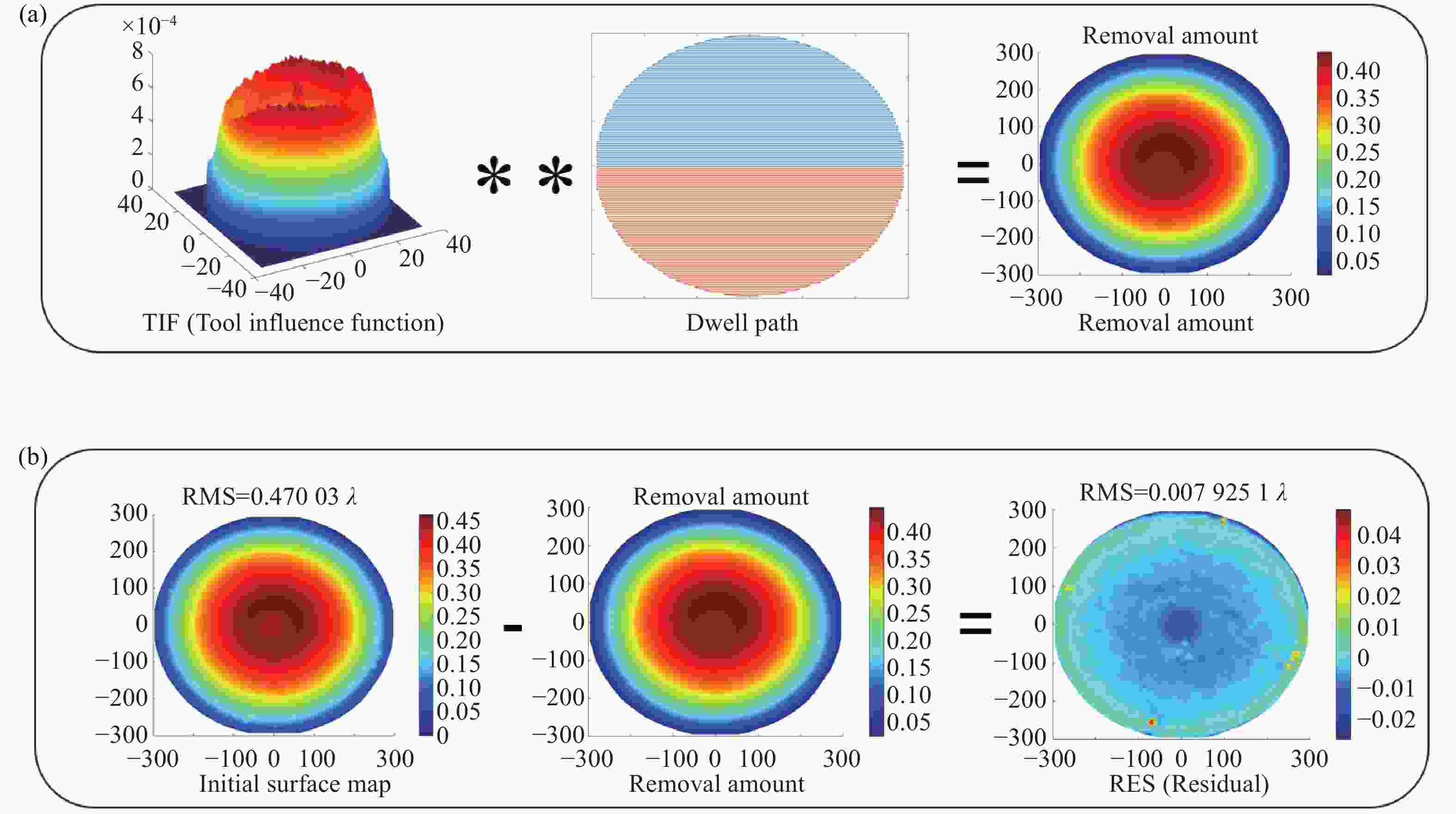 Figure 3. Simulation flowchart for simulated machining. (a) Convolution of the TIF and the dwelltime of the dwell point to obtain the removal amount; (b) simulated processing results obtained by subtracting the removal amount from the initial surface shape