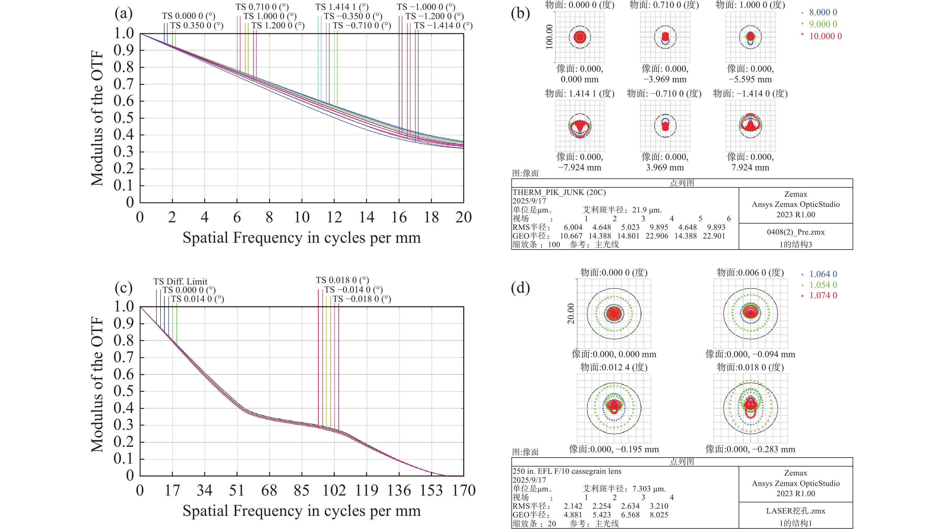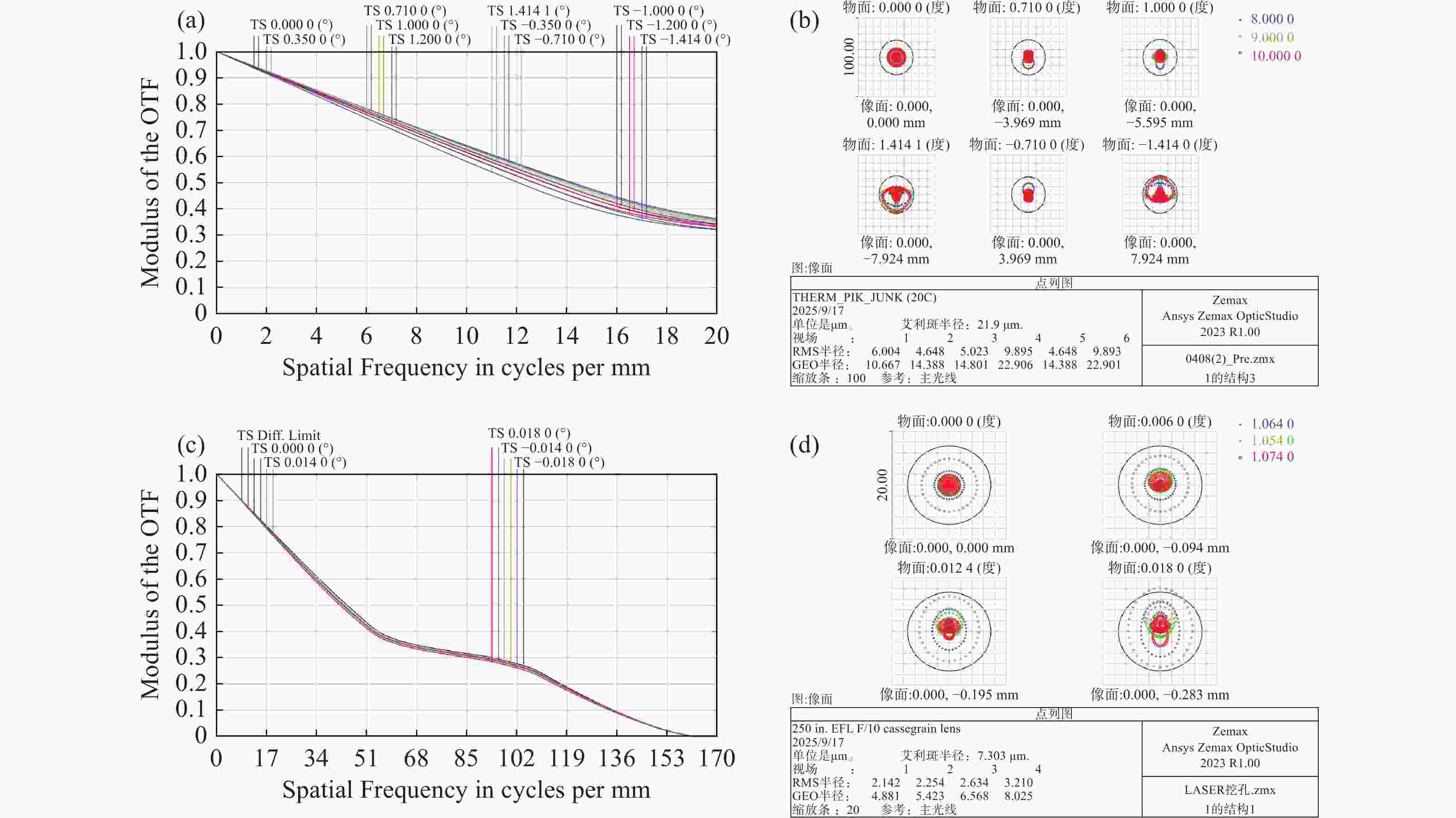 Abstract:Addressing the critical challenge of thermal radiation noise suppression in infrared systems for long-range dim target detection, this paper presents a composite detection system with an optimized cooling-based thermal radiation suppression scheme. A common-aperture optical configuration capable of simultaneous long-wave infrared and laser dual-band detection is achieved through a Ritchey-Chrétien (R-C) optical structure and a dichroic-secondary mirror with a hollow design. To mitigate thermal radiation noise, the thermal emission characteristics within the temperature range of 230 K to 320 K were analyzed using Planck’s law and non-sequential ray tracing. An improved detection range model incorporating noise terms was developed. The cooling strategy was optimized via dynamic programming, leading to an optimal solution where the main mirror and folding mirror baffles are cooled to 220 K. Experimental results demonstrate that the detection range at 300 K ambient temperature increases from 300 km to 430 km, and remains above 400 km across the entire 230−320 K range. The proposed dual-band composite detection scheme and zoned cooling methodology provide a valuable reference for the design of cold optical systems and long-range weak target detection.