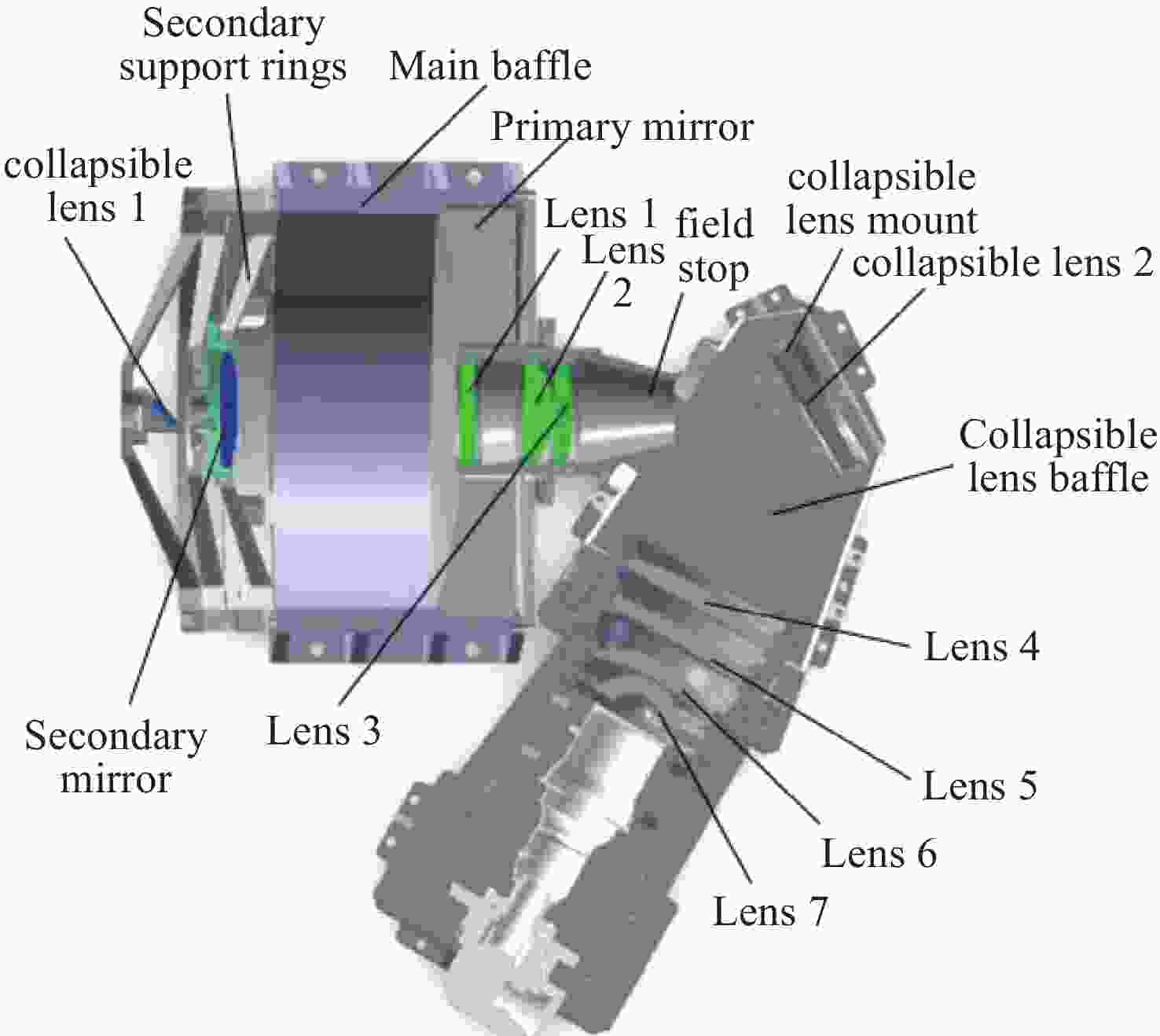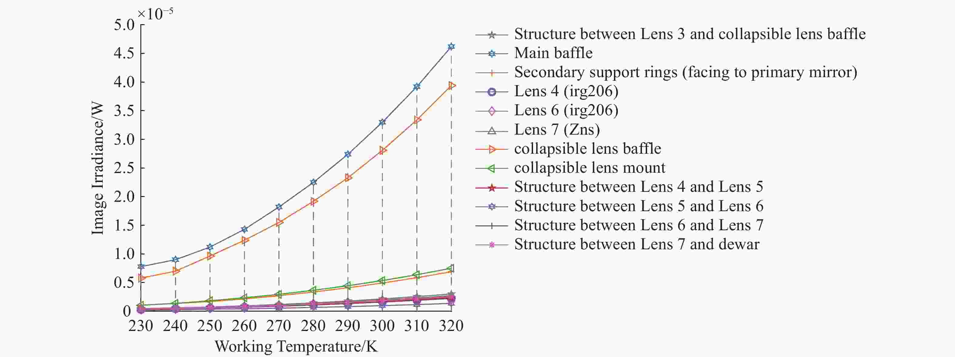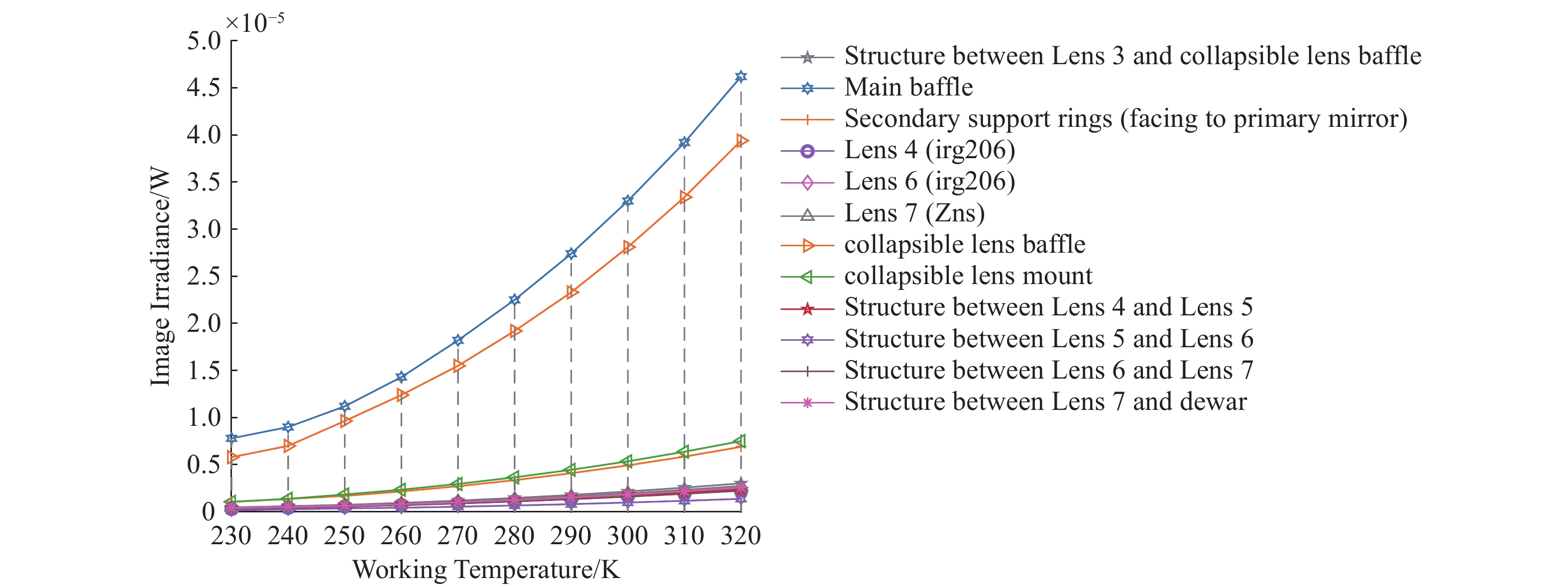 collapsible lens baffle0.8 4.65E-07 7.41E-07 1.19E-06 1.79E-06 2.57E-06 3.02E-06 Main baffle 0.8 8.47E-06 1.12E-05 1.82E-05 2.74E-05 3.92E-05 4.62E-05 Secondary support rings 0.1 1.06E-06 1.69E-06 2.72E-06 4.10E-06 5.86E-06 6.90E-06 field stop 0.9 4.39E-08 6.92E-08 1.11E-07 1.68E-07 2.40E-07 2.82E-07 collapsible lens 1 0.01 5.10E-08 8.35E-08 1.34E-07 2.02E-07 2.89E-07 3.41E-07 Lens 4 (irg206) 0.023 3.04E-07 5.63E-07 9.04E-07 1.36E-06 1.95E-06 2.23E-06 Lens 5 (ZnSe) 0.00035 5.72E-09 8.27E-09 1.33E-08 2.00E-08 2.86E-08 3.37E-08 Lens 6 (irg206) 0.022 3.60E-07 5.87E-07 9.44E-07 1.42E-06 2.04E-06 2.40E-06 Lens 7 (Zns) 0.0768 4.67E-07 6.73E-07 1.081E-06 1.63E-06 2.33E-06 2.74E-06 collapsible lens 2 0.01 7.65E-09 1.88E-08 3.02E-08 3.73E-08 6.51E-08 7.66E-08 collapsible lens baffle 0.8 5.54E-06 9.64E-06 1.55E-05 2.33E-05 3.34E-05 3.94E-05 collapsible lens mount 0.8 2.92E-07 1.84E-06 2.96E-06 4.46E-06 6.38E-06 7.51E-06 Structure between Lens 4 and Lens 5 0.8 3.34E-07 6.25E-07 1.00E-06 1.51E-06 2.07E-06 2.36E-06 Structure between Lens 5 and Lens 6 0.8 1.58E-07 3.69E-07 5.43E-07 8.15E-07 1.17E-06 1.38E-06 Structure between Lens 6 and Lens 7 0.8 3.47E-07 5.53E-07 8.88E-07 1.34E-06 1.91E-06 2.25E-06 Structure between Lens 7 and dewar 0.1 3.96E-07 6.30E-07 1.01E-06 1.53E-06 2.19E-06 2.57E-06 Total - 1.84E-05 2.95E-05 4.75E-05 7.16E-05 1.02E-04 1.21E-04 表 5 系统参数对比