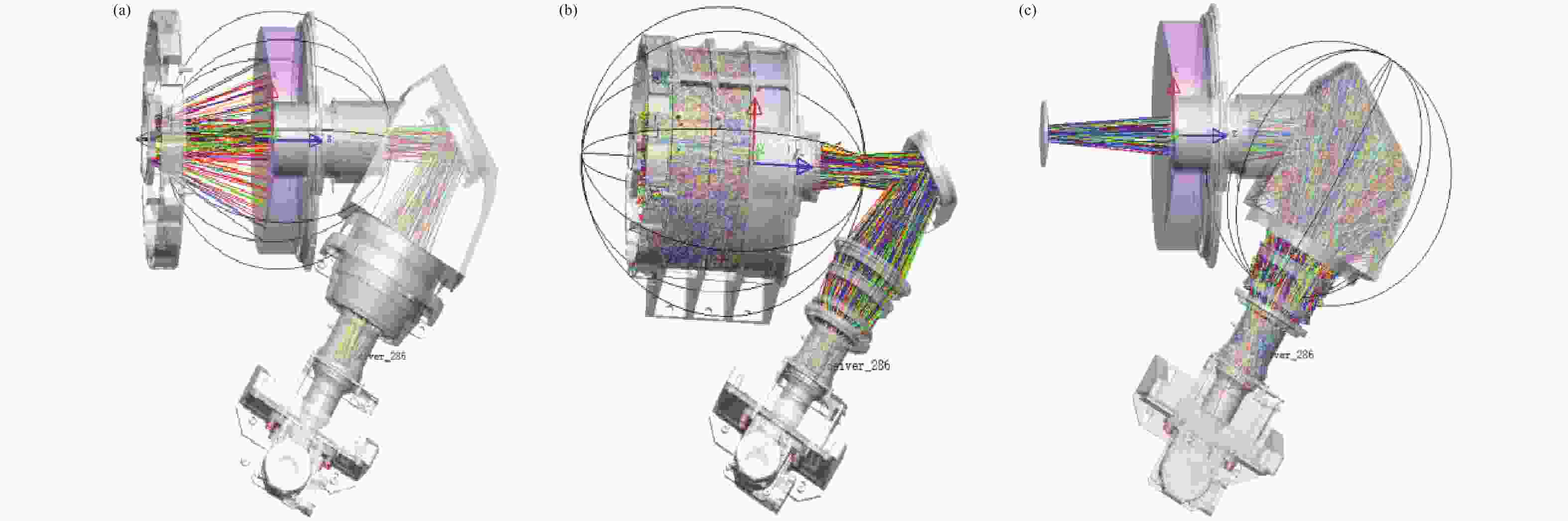 图 6 光机系统的杂散辐射分析示意图(a)主镜杂散辐射分析(b)主镜遮光罩杂散辐射分析(c)折转镜遮光罩杂散辐射分析