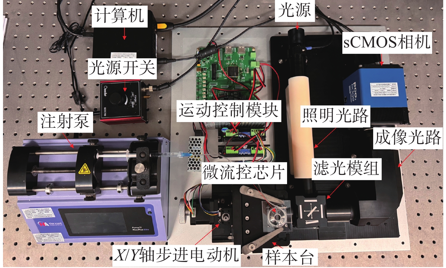 Abstract:We develop a single-molecule immunoassay detection system for flow-phase samples to enable early diagnosis of tumor biomarkers. The system includes an optical fluorescence imaging platform and an image processing algorithm. First, we developed a flow-phase single-molecule immunoassay detection method suitable for real-time detection of low-concentration, high-throughput samples. Second, we designed a set of fluorescence imaging detection platform compatible with microfluidic chips. Through the rational configuration of optical filters and beam splitters, high-resolution fluorescence imaging was achieved by utilizing multi-module integration. Finally, based on the image detection and counting algorithm for out-of-focus particles, we optimized a feature-matching algorithm to effectively detect out-of-focus fluorescent particles. Experimental results demonstrate a detection limit of 0.001 pg/mL within a linear range of 0.001−1 pg/mL, with coefficient of variation below 10%. The system can process up to 10 samples per hour. These findings indicate that our system meets the requirements for stable, sensitive, and high-throughput single-molecule immunoassay detection, showing promising potential for early cancer screening.