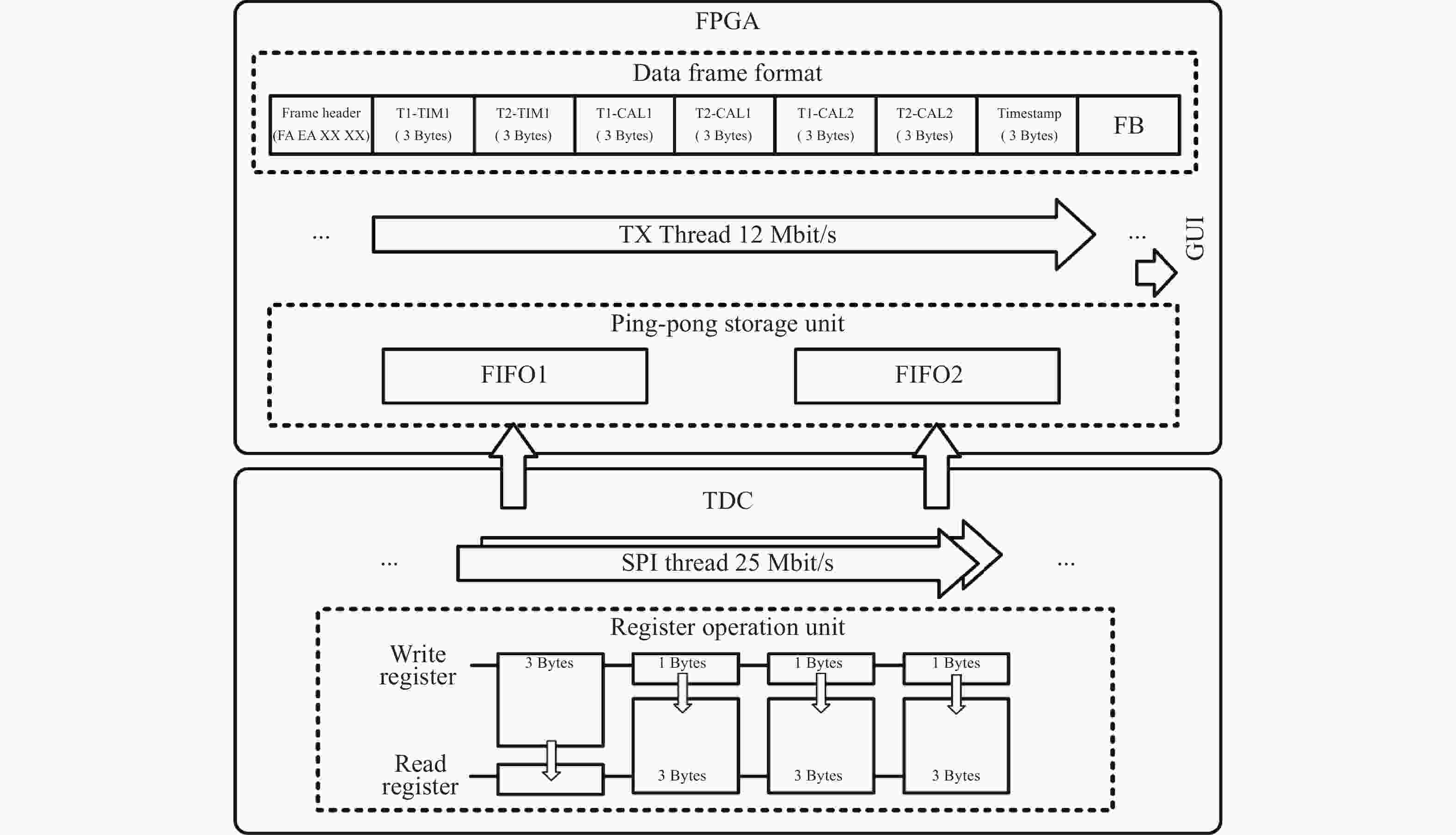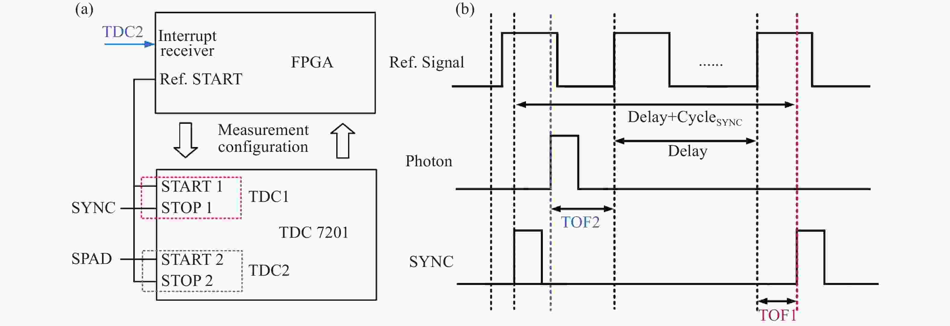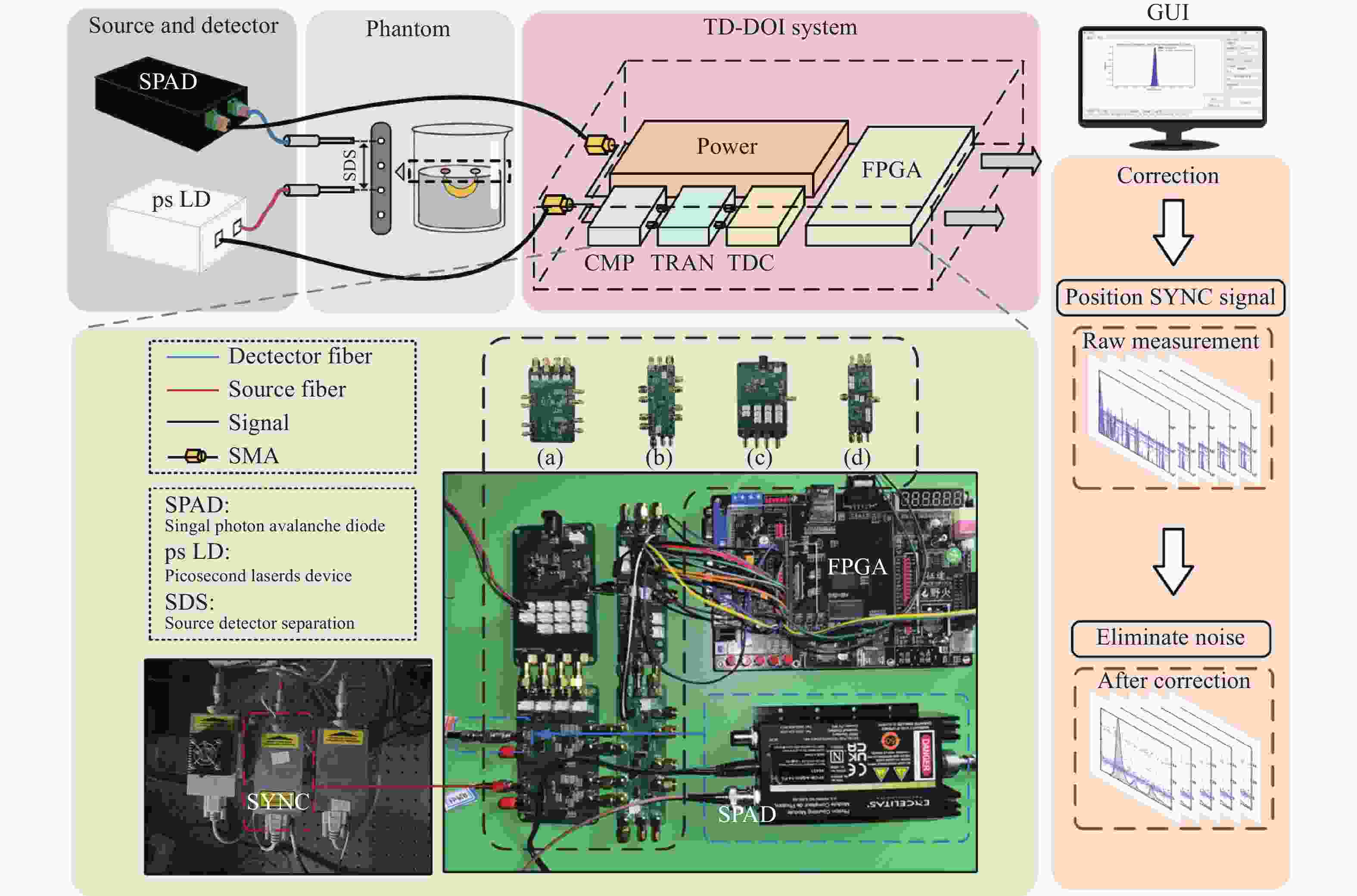 时域扩散光学成像(time domain diffuse optical imaging, TD-DOI)作为一种先进的组织光学成像技术,通过时间相关单光子计数(time-correlated single photon counting, TCSPC)系统可实现生物组织吸收系数与散射系数的定量重建,从而精确评估组织氧代谢、血流灌注等关键生理参数。然而,受限于TCSPC系统固有的硬件复杂性、高成本特性,目前难以实现临床场景下在体多通道动态监测的规模化应用。本文发展了一种双通道差分混合触发参考信号策略,通过结合差分时间数字转换(time-to-digital converter, TDC)器件和光子计数技术,构建稳定可靠的时间扩展曲线(time point spread function, TPSF)测量体系,实现了激光同步信号与出射光子信号时间延迟的亚纳秒级精确标定。实验验证数据显示,所发展系统时间分辨率为55 ps,在2.3×104 光子/s计数率下,TPSF波动系数可稳定控制在1.35%以内(积分时间1 s)。针对组织仿体的光学参数反演测试表明,组织光学参数反演精度方面,吸收系数与约化散射系数的平均反演误差分别在5.39%和4.34%以内。该技术方案显著提升了TD-DOI多通道并行检测可行性,特别适用于脑皮层血氧饱和度动态监测等生物医学场景,为开发新一代穿戴式光学脑功能成像设备奠定了技术基础。