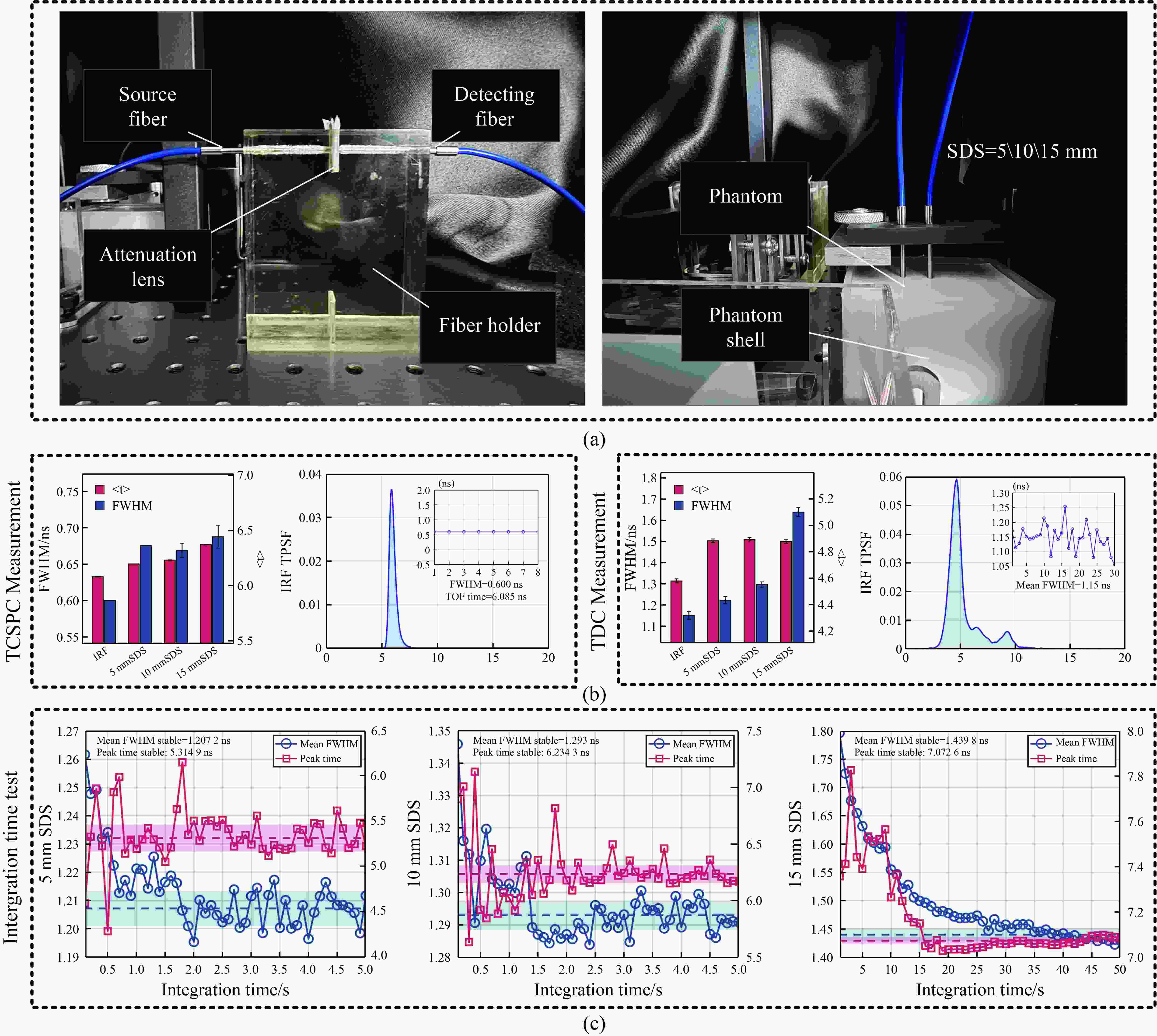 Figure 7. Evaluation results of TPSF stability in the phantom experiment. (a) Experimental configuration diagram (phantom dimensions: 85 cm (L) × 50 cm (W) × 50 cm (H)); (b) comparison of the of the IRF between TCSPC and the TDC module; (c) variation of FWHM and <t> of TDC module under different configurations