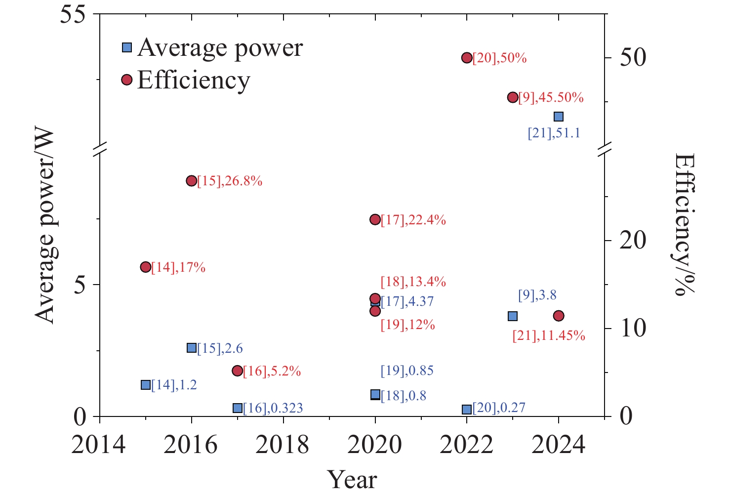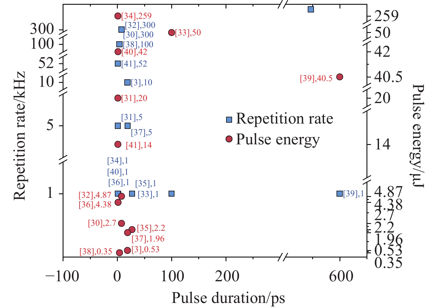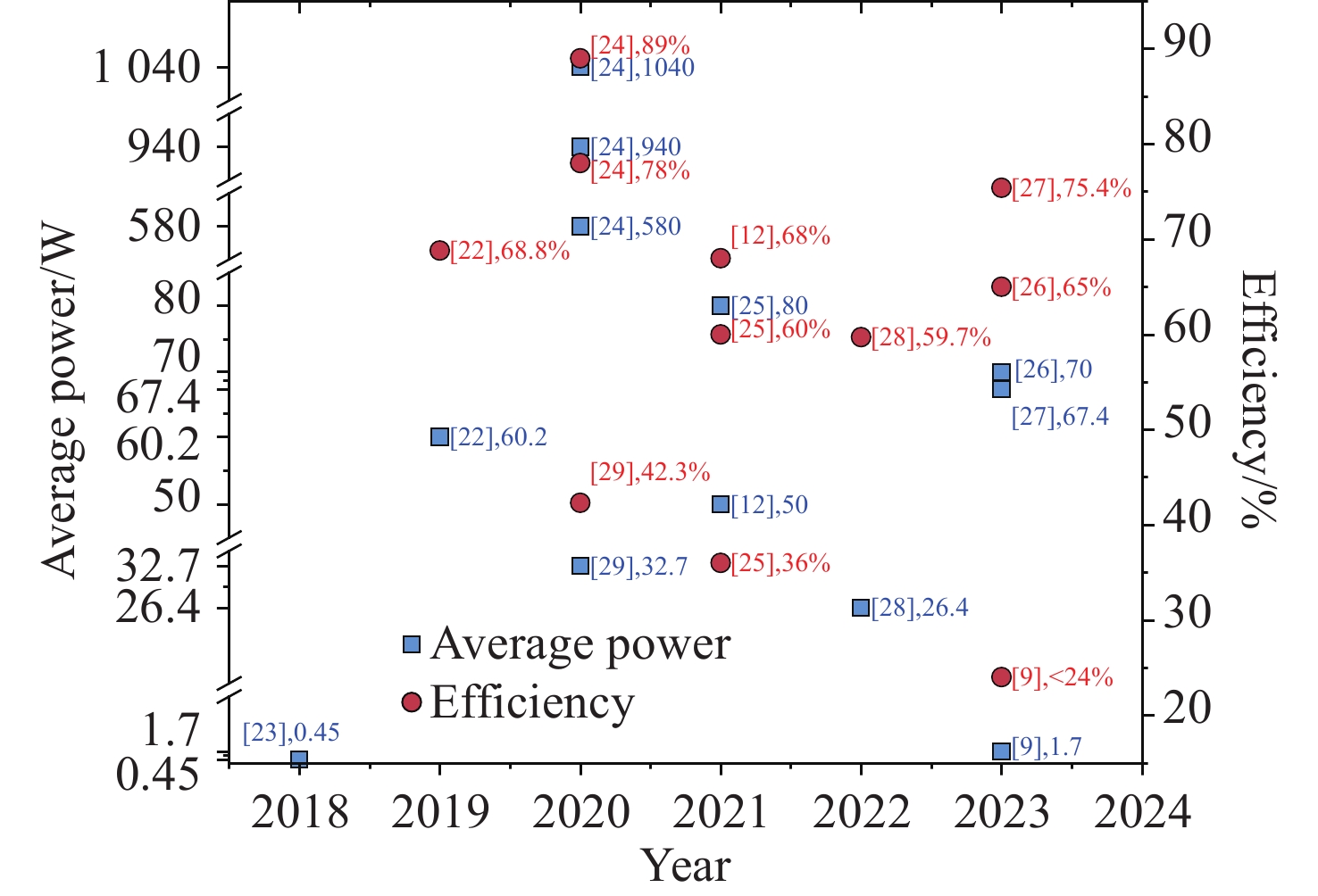 0.05 °C67.4 532 33.7 mJ 41.8 ns 75.40 - 1.31 2 1064 - 2023[26] LBO 长40 158.85 °C 70 528 0.78 mJ 65 - - 9004 1056 12 ns 2021[25] LBO - 142.85 °C 807 535 - - 36 - 1.28 400 1070 13 ns 2021[25] LBO - 142.85 °C 807 528 - - 60 - 1.28 400 1056 13 ns 2020[24] LBO 10*10*10 - 580 515 0.58J 2 ns5 89 - - 1 1030 - 2020[24] LBO 10*10*13 - 940 515 0.94J6 2 ns 78 - 1.4/1.323 1 1030 - 2020[24] LBO 10*10*13 - 1040 515 1.04J6 2 ns - - - 1 1030 - 1. 水冷铜炉温度为20 °C;2. 腔内倍频的脉宽;3. 为$ \text{M}_{\text{x}}^{2}/\text{M}_{\text{y}}^{2} $简写;4. 经由第一块晶体倍频产生;5. 基频光经时间整形至方形脉冲;6. 经由两块LBO晶体倍频输出的总能量;7. 输出的528 nm和535 nm混合光的平均功率;8. 输出的528 nm和535 nm混合光的光束质量; 表 3 皮秒级脉宽倍频研究进展(按倍频输出平均功率升序)