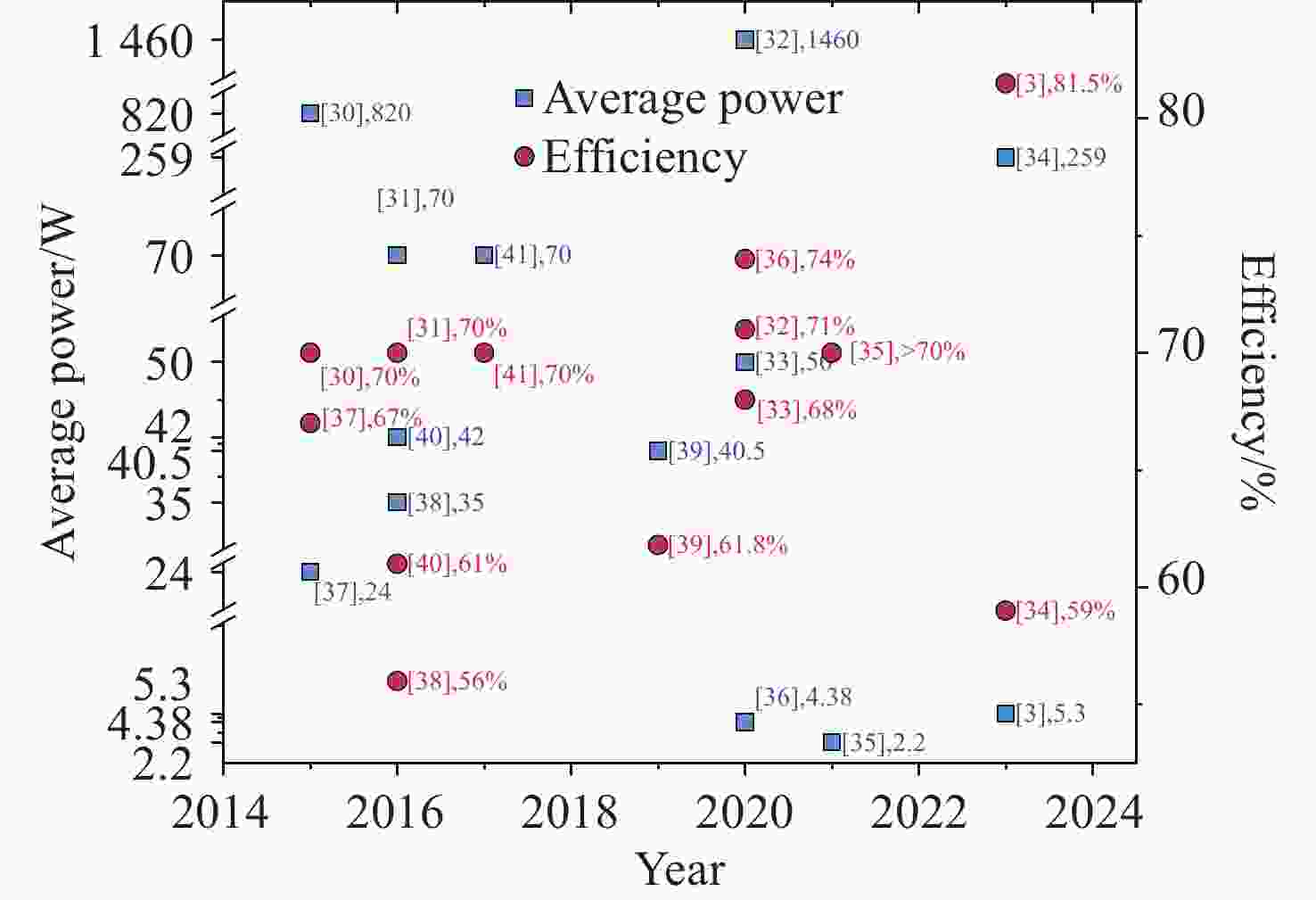 (ns)2022[20] LBO - 150 °C 0.27 532 270 50 50 - - 1 1064 - 2017[16] PPLN 1*1*1.2 25 °C 0.323 532.7 4.84 320 5.2 6.9 - 66.7 1064 - 2020[18] BBO 4*4*8 20 °C 0.8 539.9 80 33.9 13.40 - - 10 1080 - 2020[19] LBO 3*3*10 29 °C 0.85 532 69 - 12 - - 12.41 1064 35 2015[14] GTR-KTP 3*3*7 室温 1.2 532 162 12.15 17 - <1.5 75 1064 - 2016[15] LBO 2*2*15 20 2.6 535 86.7 36.6 26.8 - - 26.8 1070 - 2023[9] KTP 4*4*10 20 3.8 532 380 192 45.504 - 1.6/1.73 10 1064 - 2020[17] BBO 4*4*8 20 °C 4.37 532 72.83 36 22.40 - - 60 1064 - 2024[21] LBO - - 51.1 527 50 mJ 98.7 11.45 - 18.1/14.593 1 1054 1. 基频光重频;2. 泵浦功率7 W时测得; 3. 为$ \text{M}_{\text{x}}^{2}/\text{M}_{\text{y}}^{2} $简写;4.效率为倍频转换效率;5.泵浦功率5.8 W时测得; 表 2 纳秒级腔外倍频研究进展(按倍频输出平均功率升序)