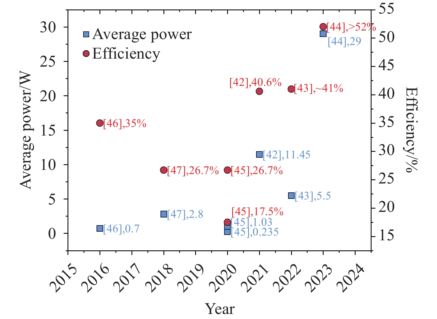 脉宽2021[35] LBO - 40 °C 2.2 532 2.2 mJ 27 ps >70 1.5 1 1064 2020[36] LBO 8*8*2 - 4.38 515 4.38 mJ 1.3 ps 74 <1.6 1 1030 2023[3] LBO 4*4*12 50 °C 5.3 532.2 0.53 mJ 18.6 ps 81.50 1.09/1.121 10 1064 2015[37] LBO 4*4*20 24 1.96 mJ 18.9 ps 67 1.753 5 1064 2016[38] LBO 8*8*10 47 °C 35 515 0.35 mJ - 56 1.4/1.61 100 1030 4 ps 2019[39] LBO 9*9*20 - 40.5 532 40.5 mJ - 61.8 1.26/1.251 1 1064 600 ps 2016[40] LBO 厚1.47 - 42 515 42 mJ - 61 - 1 1030 1.2 ps 2020[33] LBO 6*6*15 149 °C 50 532 50 mJ - 68 3.358/2.4571 1 1064 100 ps 2016[31] BBO 厚1.5 室温 70 515 20 mJ - 70 1.84/1.661 5 1030 1 ps 2017[41] β-BBO 厚1.5 - 70 515 14 mJ - 70 52 1030 1 ps 2023[34] LBO - - 259 515 259 mJ - 59 - 1 1030 1 ps 2015[30] LBO 6*6*5 47 °C 820 515 2.7 mJ - 70 1.53/1.991 300 1030 7.7 ps 2020[32] LBO 15*15*5 47 °C 1460 515 4.87 mJ - 71 1.38/1.431 300 1030 7.7 ps 1. 为$ \mathrm{M}_{\mathrm{x}}^{2}/\mathrm{M}_{\mathrm{y}}^{2} $简写; 2. 基频光重频;3. 最大绿光脉冲能量1.96 mJ输出时测得; 表 4 飞秒级脉宽倍频研究进展(按倍频输出平均功率降序)