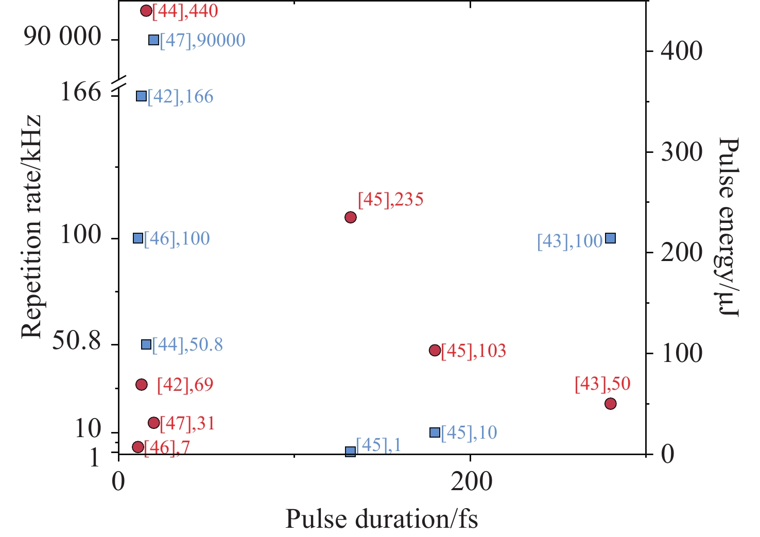 (fs)2020[45] KBOB 7*7*1 0.235 515 235 132 fs 26.70 - 1 kHz 1030 180 fs 2016[46] KDP 厚1 0.7 515 7 11 fs 35 - 100 kHz 1030 - 2020[45] KBOB 7*7*1 1.03 515 103 - 17.50 - 10 kHz 1030 180 fs 2018[47] - - 2.8 532 31 <20 fs 26.7 - 90 MHz 1063 - 2022[43] LBO 3*3*4 5.5 530 50 - ~41 - 100 kHz 1060 280 fs 2021[42] BBO 厚1 11.45 515 69 13 fs 40.6 - 166 kHz 1030 - 2023[44] BBO 长1.5 29 515 440 15.7 fs >52 1.19/1.171 50.8 kHz 1030 - 1. 为$ \mathrm{M}_{\mathrm{x}}^{2} $/$ \mathrm{M}_{\mathrm{y}}^{2} $简写形式 -