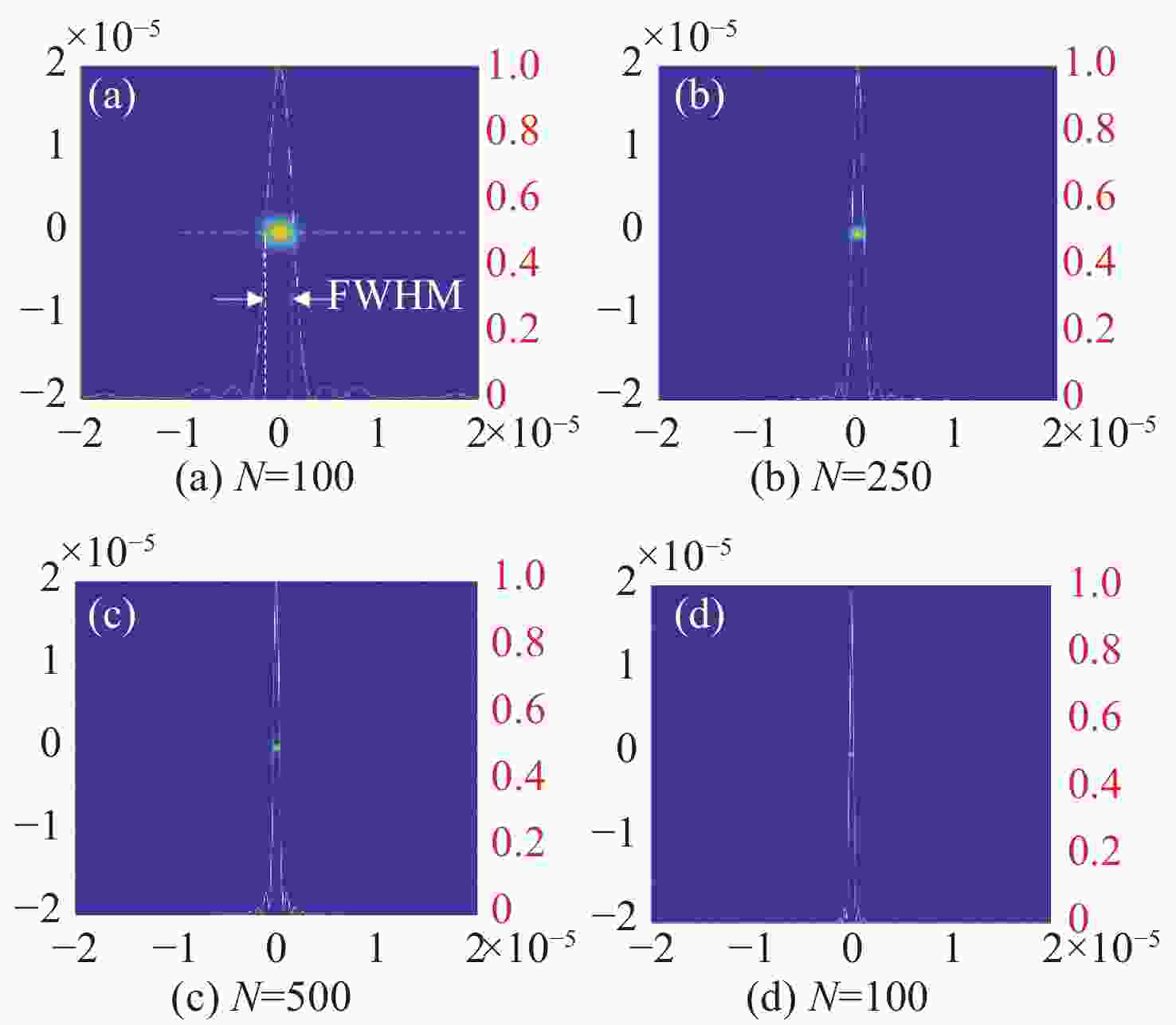 $ 0 $ ,(b)$ \dfrac{\mathrm{{\text{π}} }}{4} $ ,(c)$ \dfrac{\mathrm{{\text{π}} }}{2} $ ,(d)$ \dfrac{3\mathrm{{\text{π}} }}{4} $ 。图中第一行左侧箭头表示入射线偏振光的方向,右侧箭头表示焦平面前偏振片传输轴的方向Figure 7. Lignt intensity varies with the polar angle and their normalized intensity distribution curves. The rotation angles of incident polarized light are (a)