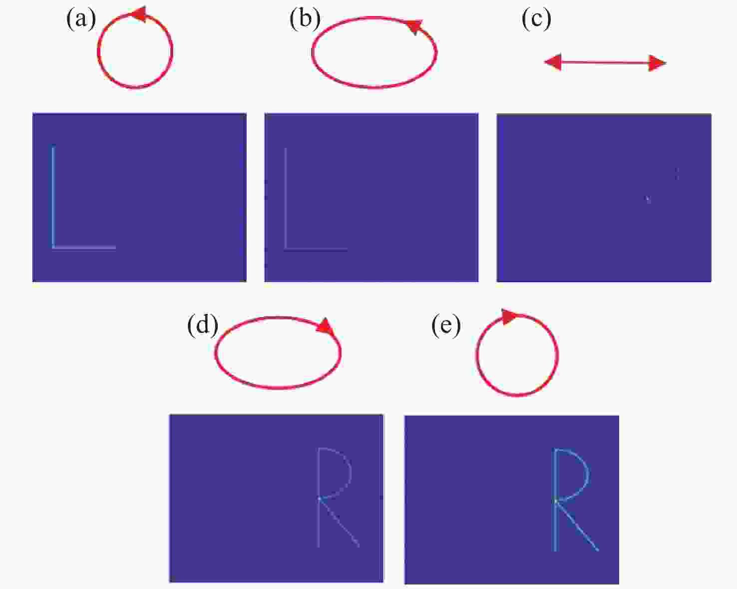 图 5 不同偏振入射光对应的图像。(a)左旋圆偏振光入射;(b) 左旋椭圆偏振光入射;(c) 线偏振光入射;(d) 右旋椭圆偏振光入射;(b) 右旋圆偏振光入射。上面表示入射的偏振状态,下面表示相应偏振态入射时焦平面处的图像