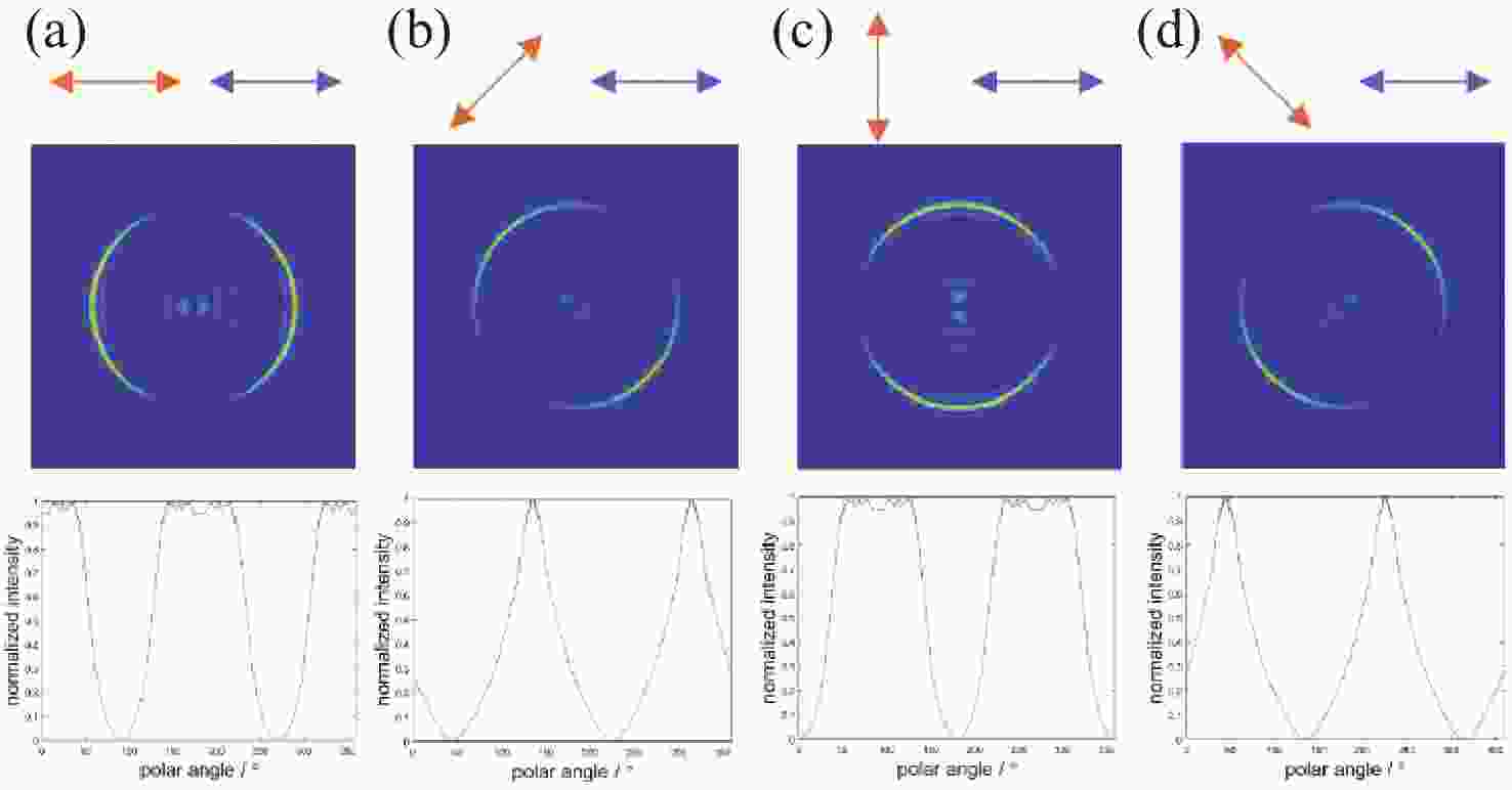 $ 0 $ ,(b)$ \dfrac{\mathrm{{\text{π}} }}{4} $ ,(c)$ \dfrac{\mathrm{{\text{π}} }}{2} $ ,(d)$ \dfrac{3\mathrm{{\text{π}} }}{4} $ 。图中第一行左侧箭头表示入射线偏振光的方向,右侧箭头表示焦平面前偏振片传输轴的方向Figure 6. Different figures of which the intensity varies with the polar angle and their normalized intensity distribution curves. The rotation angles of incident polarized light are (a)