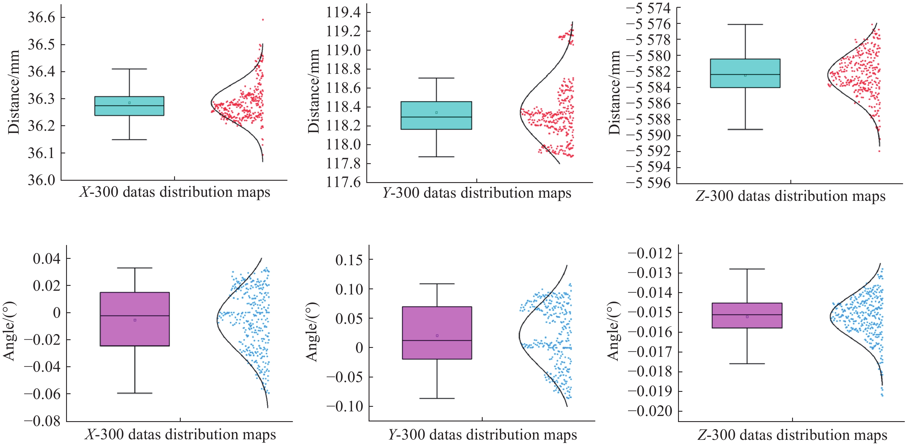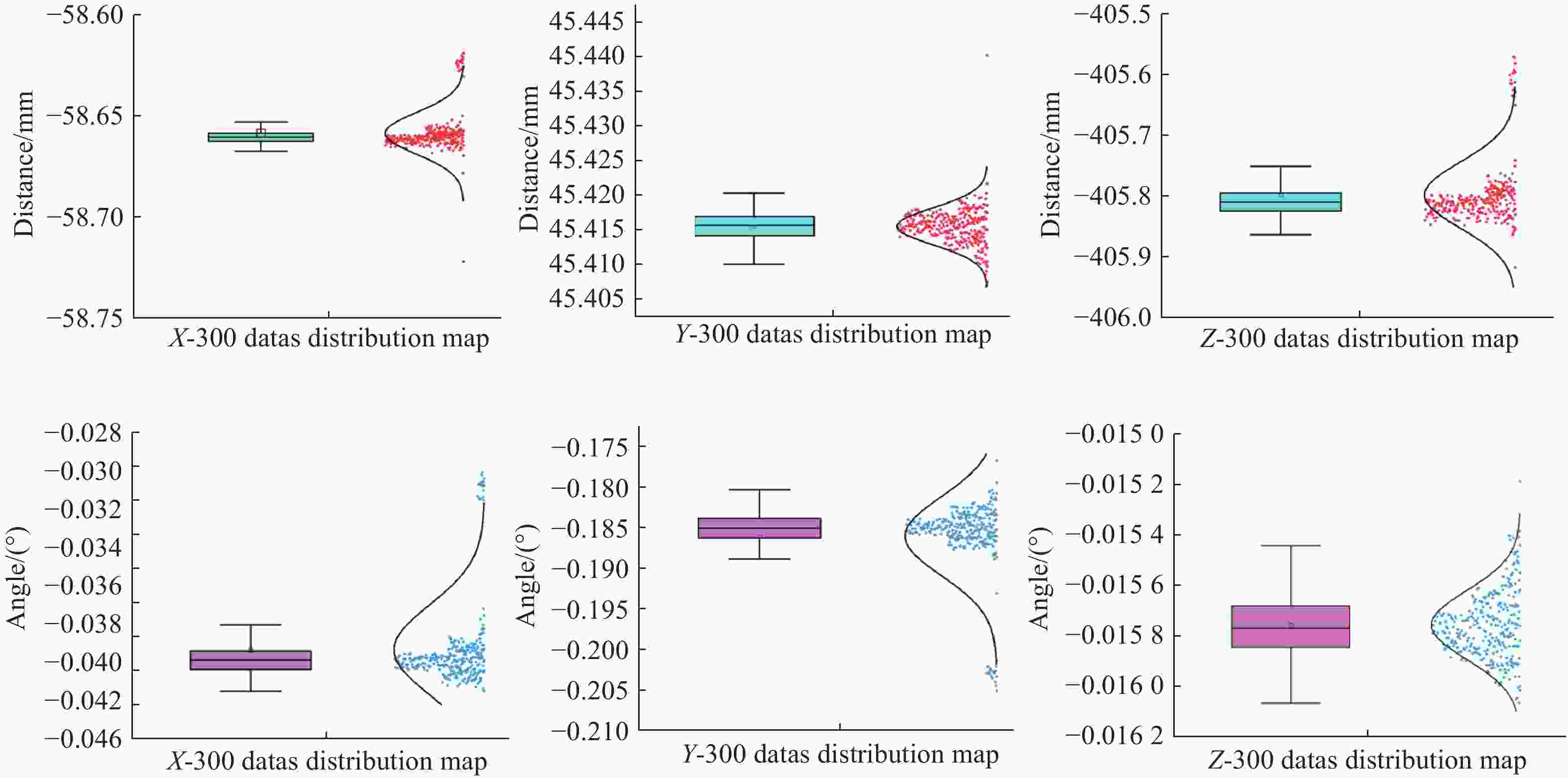 Parameters Std Mean-value Max-v Min-v Tx/mm 0.08 −58.63 − 58.3670 −58.72 Ty/mm 0.003 45.41 45.478 45.40 Tz/mm 0.10 −405.79 −402.922 −405.89 $\varphi $/(°) 0.003 −0.041 0.0009 −0.043 $\theta $/(°) 0.006 −0.184 −0.046 −0.07 $\psi $/(°) 0.0003 − 0.0157 −0.007 − 0.0161 -
