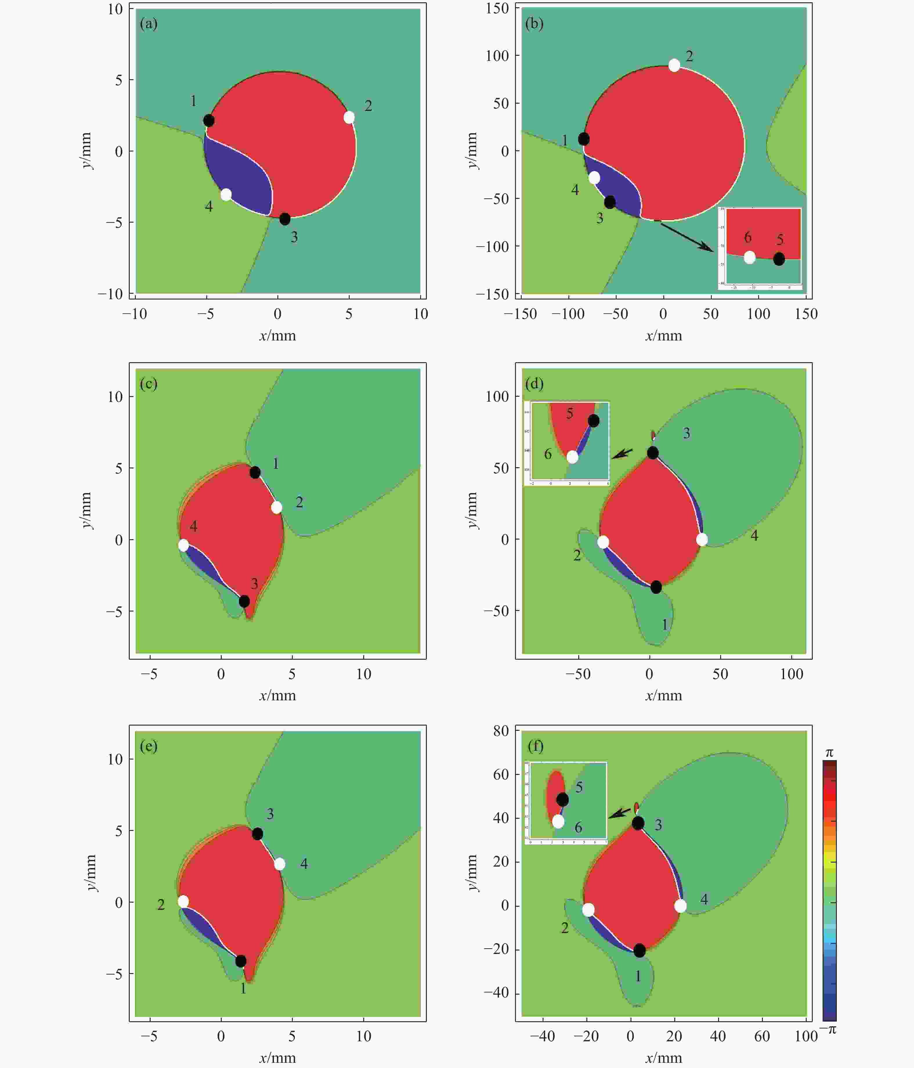 图 3 GSMV光束海洋湍流中不同离轴参数 s 的 S12等相位图。(a) s = −0.8 mm;(b) s = −0.46 mm;(c) s = −0.41 mm; (d) s = 0.41 mm; (e) s = 0.46 mm; (f) s = 0.8 mm