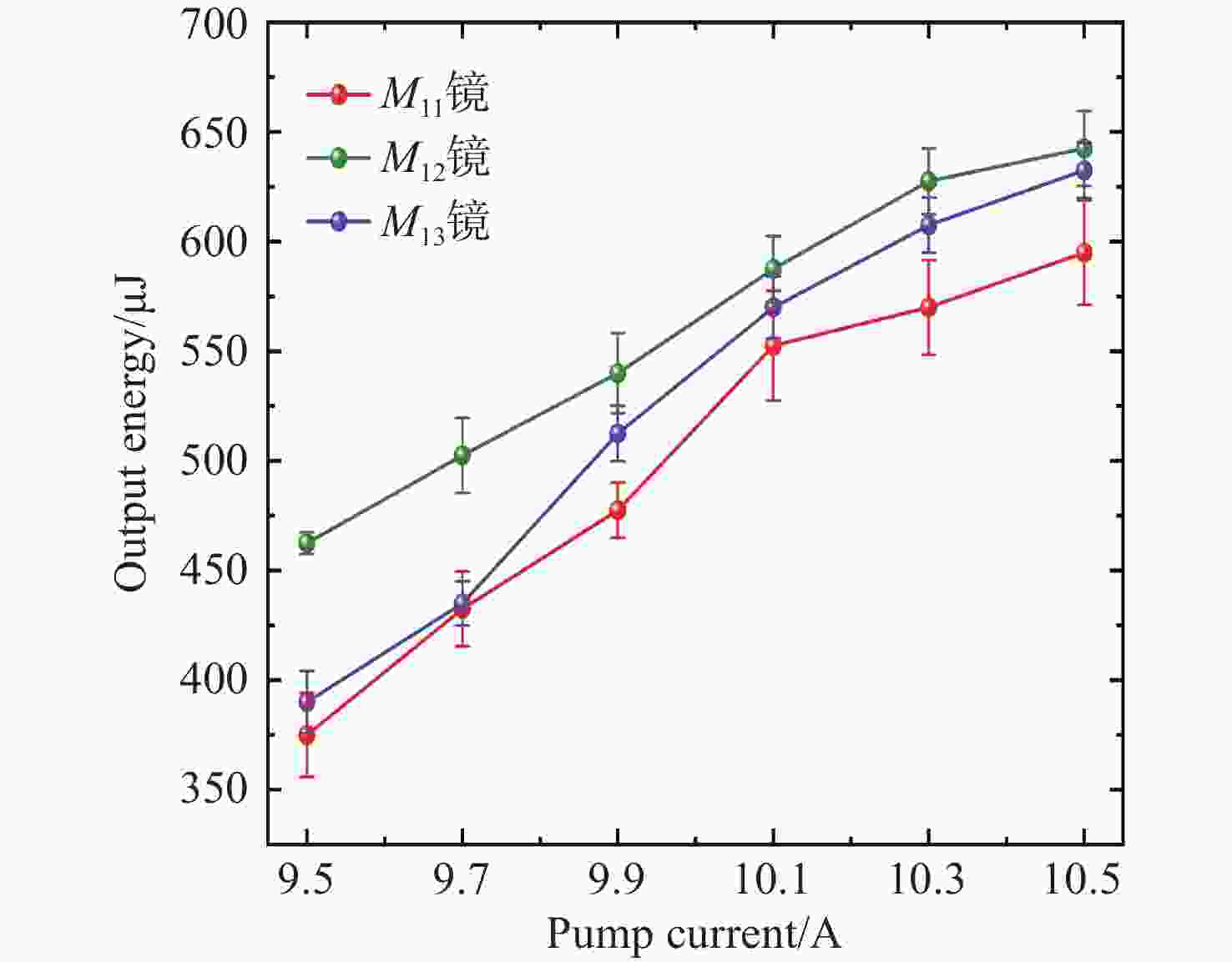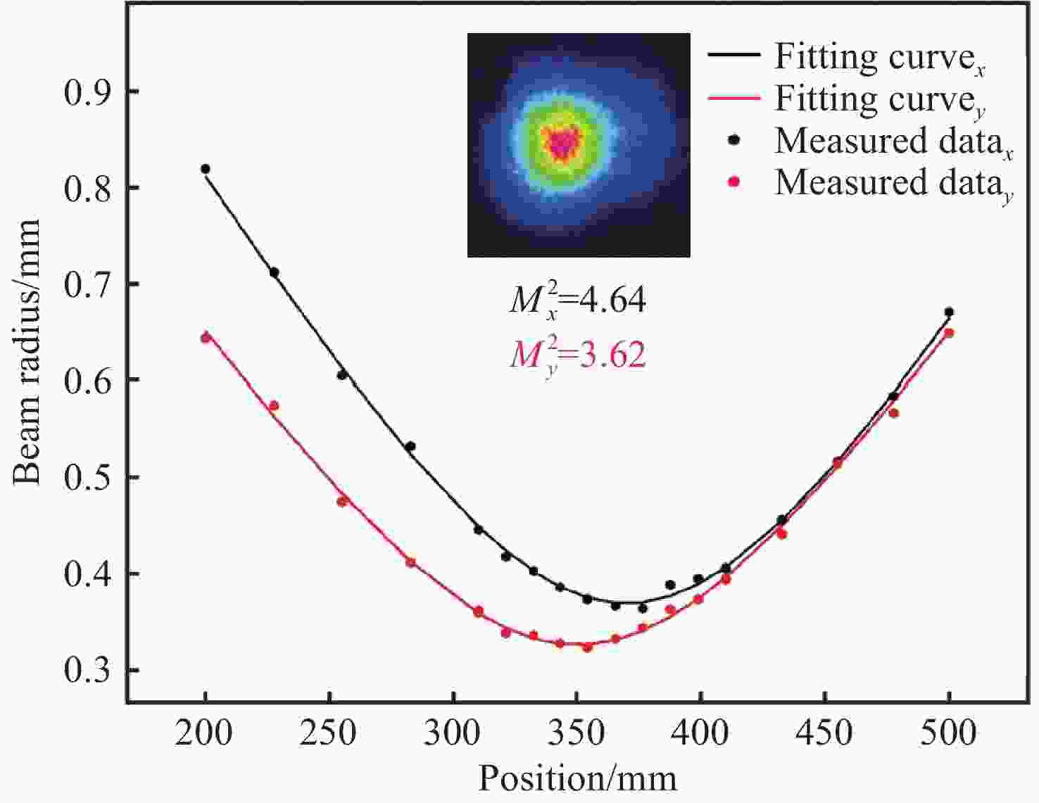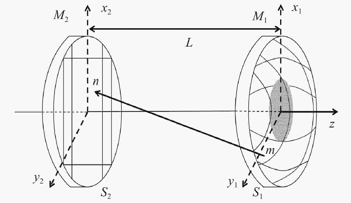 M x 2=2.09、M y 2=2.20的1064 nm高光束质量激光输出。Abstract:To achieve high-power and high-beam-quality laser output from a laser-diode (LD) side-pumped solid-state laser, we investigate an unstable resonator incorporating a Gaussian output mirror. The boundary finite element method was utilized to analyze the effects of the resonant cavity length, Gaussian mirror membrane spot radius, and curvature radius on high-order mode suppression. The functional theory of mode loss difference was applied to determine the mode-matching range and the optimal parameters for the spot radius. Furthermore, an output power model was established to derive the theoretical optimal central transmittance for compensating loss. Based on the theoretical and simulation results, the resonator parameters were optimized, and the output beam’s mode distribution and quality were experimentally characterized using different Gaussian mirrors. Under the operational conditions of a 400 mm resonator length, 7.3 A pump current, and 100 Hz repetition frequency, the implementation of a Gaussian mirror with a 3 mm spot radius, 1.5 m curvature radius, and 17% central transmittance produced a high-quality