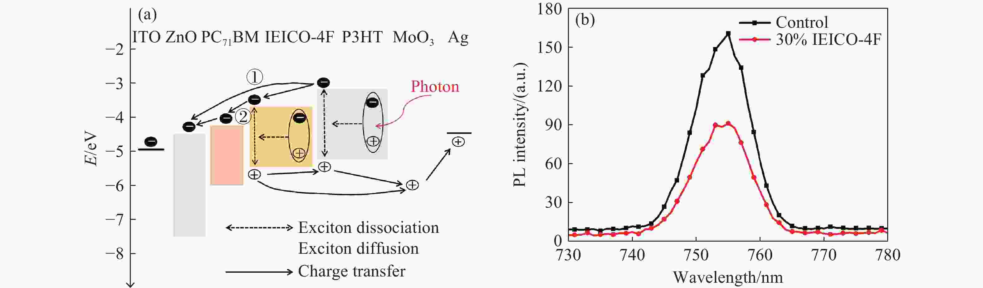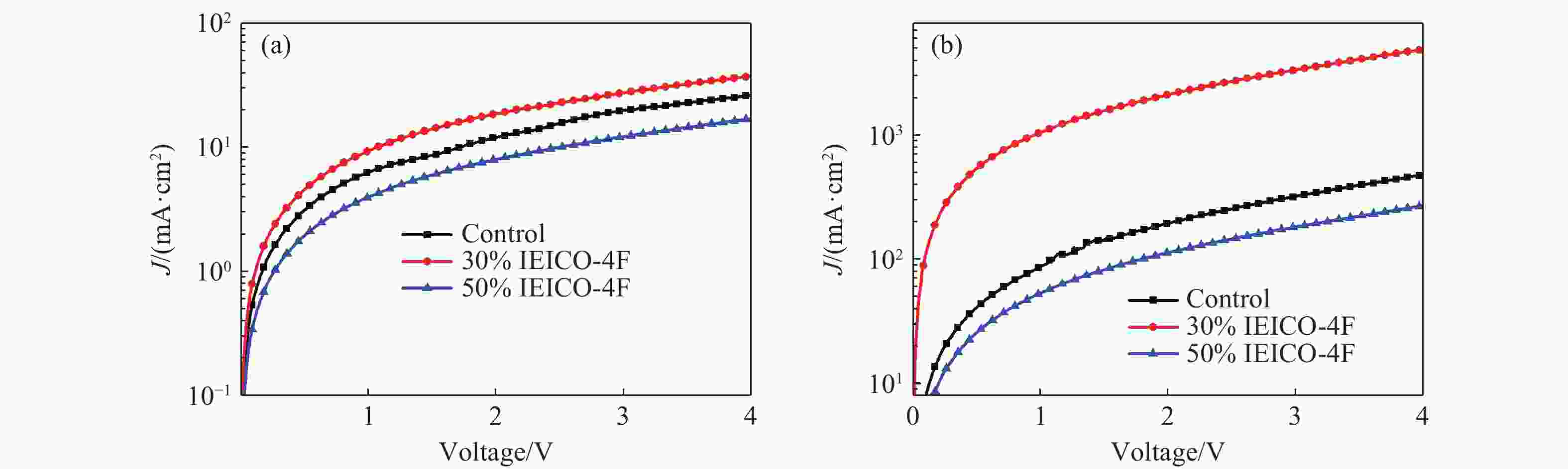 (×1012 Jones)Control 19.17 (±0.35) 3.81 (±0.32) 323.1 (±0.01) 0.78 (±0.18) 10% 24.36 (±0.42) 4.06 (±0.27) 354.5 (±0.03) 1.13 (±0.25) 30% 27.25 (±0.39) 1.70 (±0.18) 409.9 (±0.01) 1.45 (±0.14) 50% 9.07 (±0.34) 7.85 (±0.22) 30.1 (±0.02) 0.09 (±0.11) 表 2 不同IEICO-4F掺杂比例下的器件阻抗参数
