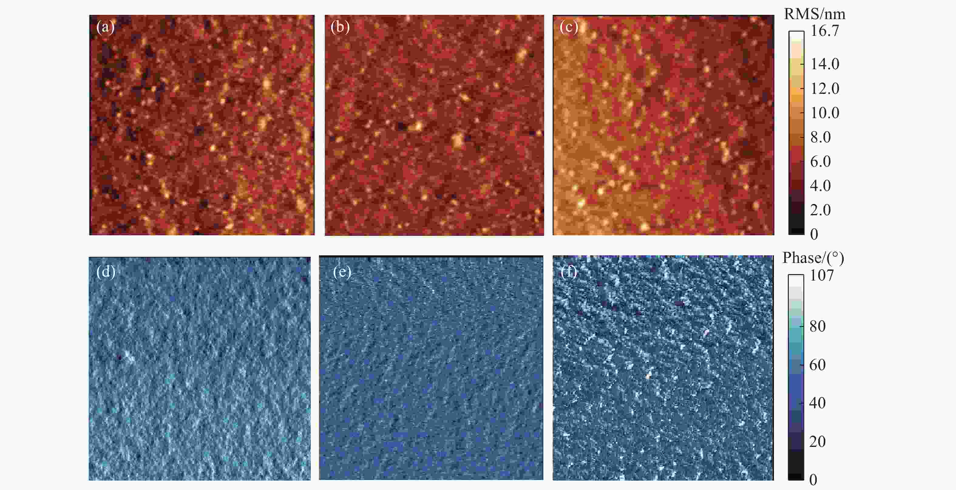 图 6 (a) 无掺杂的RMS图;(b) 30%的IEICO-4F掺杂下的RMS图;(c) 50%的IEICO-4F掺杂下的RMS图;(d) 无掺杂的相图;(e) 30%的IEICO-4F掺杂下的相图;(f) 50%的IEICO-4F掺杂下的相图