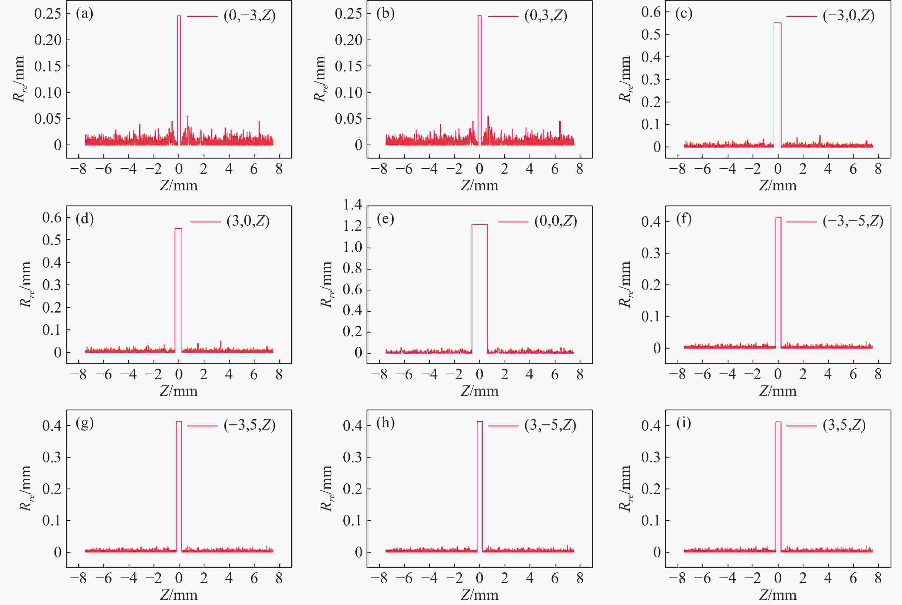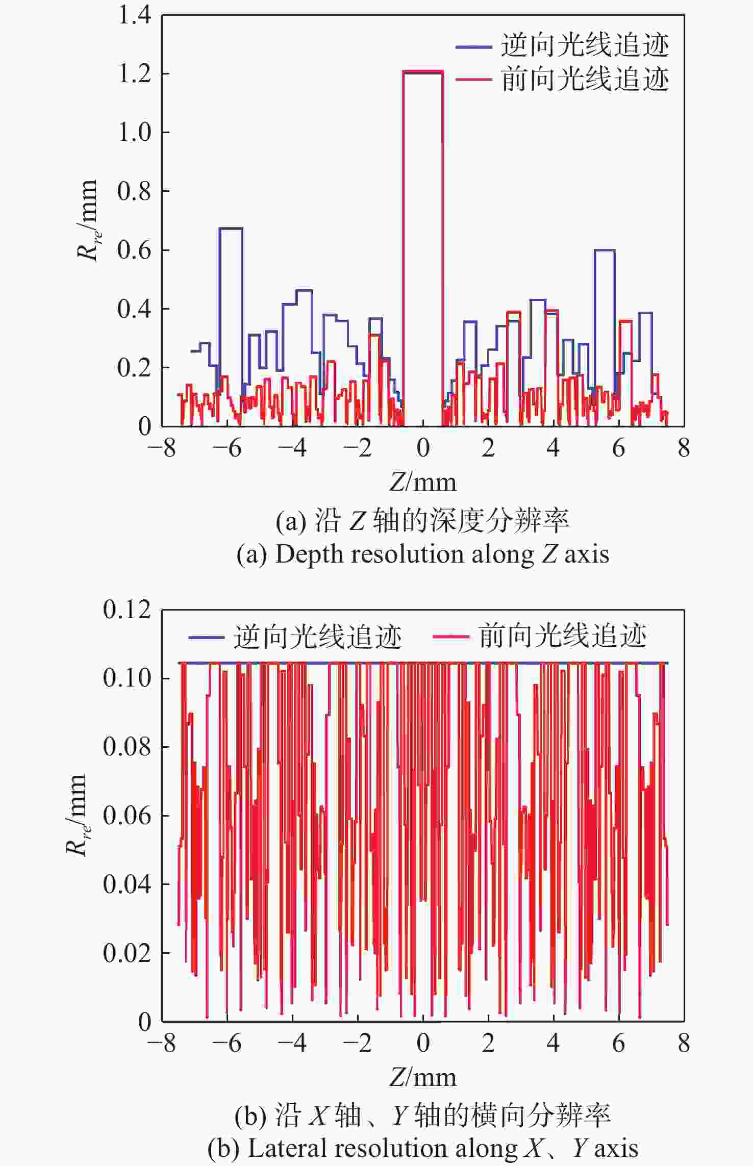 M l )对光场相机深度分辨率的影响。结果表明,光场相机在物平面与光轴交点附近以外的区域具有较高的深度分辨率。光场相机2.0在(0,0,0)附近区域的深度分辨率优于光场相机1.0。对于正方形排列的微透镜阵列,光场相机2.0的横向分辨率较光场相机1.0略有提升。光场相机1.0的深度分辨率随着M l 的增大而逐渐降低。Abstract:In the process of 3D scene reconstruction, the spatial resolution of the light field camera (LFC) affects the recoverable spatial details as well as the depth resolution, thereby influencing the accuracy of the 3D reconstruction. Therefore, calculating and analyzing the spatial resolution of the LFC is crucial for identifying the high and low resolution regions. In this paper, a calculation method for the spatial resolution of an LFC is explored based on the forward ray-tracing technique, which has the advantage of high accuracy. The spatial resolutions of LFC 1.0 and LFC 2.0 under different microlens array configurations are quantitatively calculated and compared. In addition, the effects of the inverse magnification (