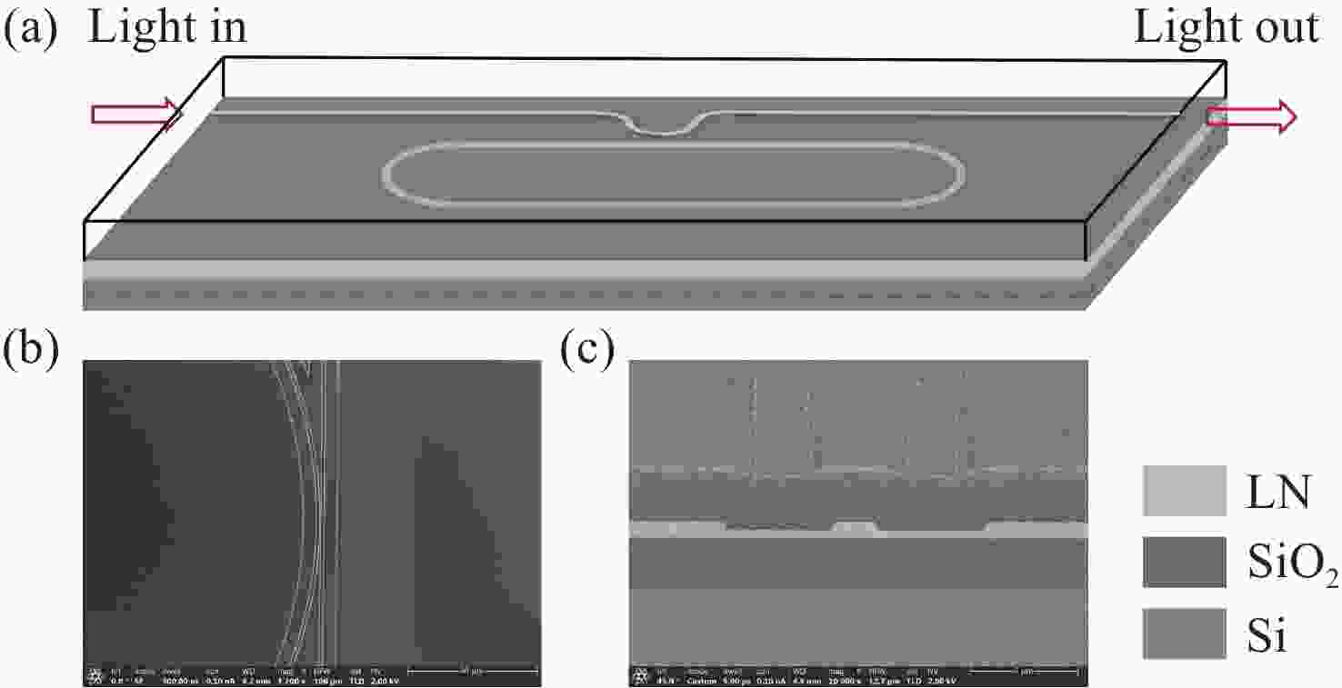 图 1 本文提出的温度传感器结构示意图。(a) 微环谐振器的三维示意图;(b) 耦合区域的扫描电子显微镜显微图像;(c) 显示硅/二氧化硅/铌酸锂(Si/SiO2/LN)异质界面的横截面透射电子显微镜图像