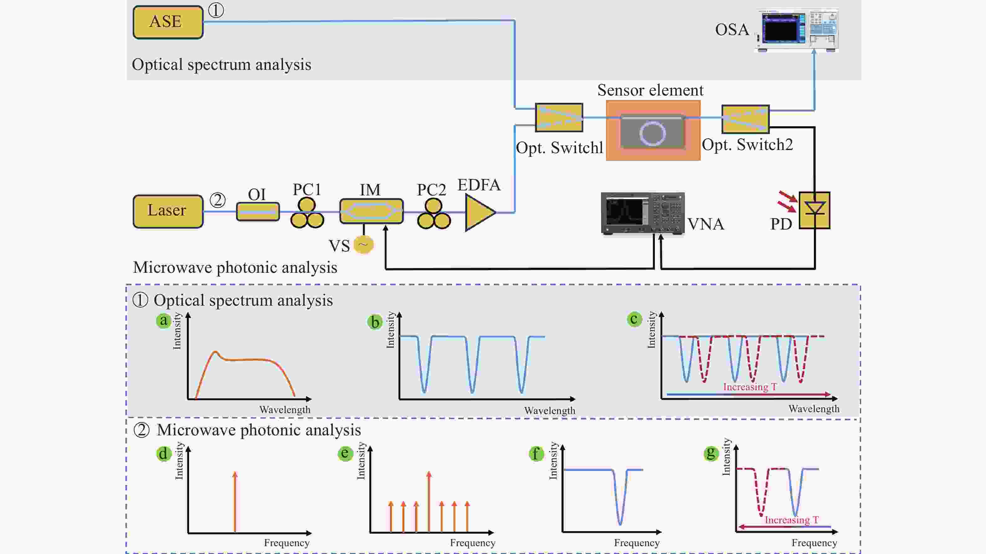 Figure 3. Schematic diagram of the temperature sensing system and operational principle. (ASE: amplified spontaneous emission; OI: optical isolator; PC: polarization controller; IM: intensity modulator; VS: Voltage source; EDFA: Erbium-doped Optical Fiber Amplifier; Opt. Switch: optical switch; PD: photodetector; VNA: vector net analyzer; OSA: optical spectrum analyzer)