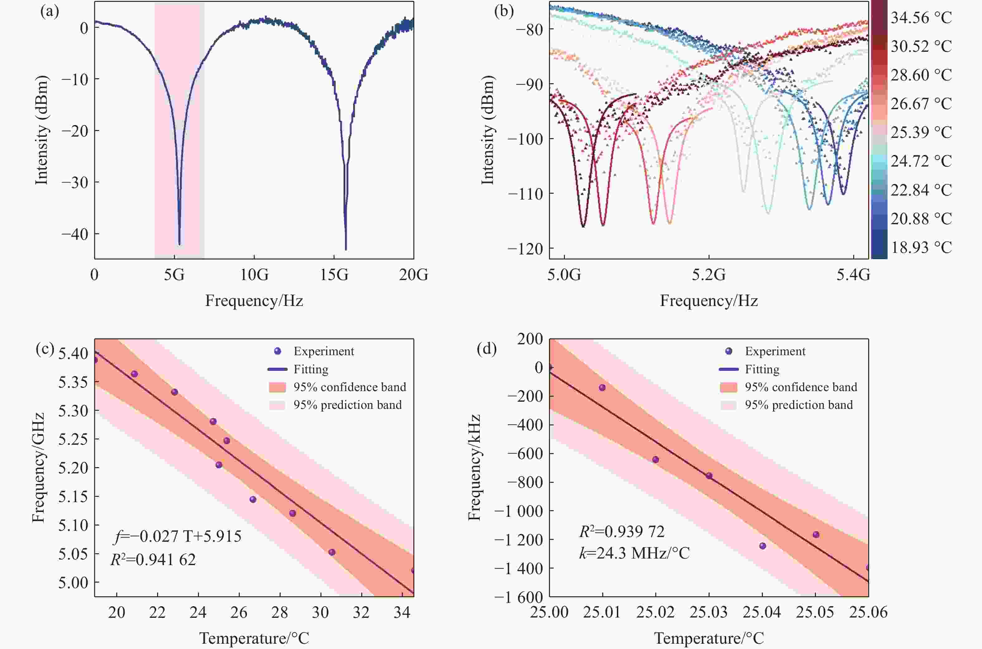 图 5 基于微波光子技术的温度信号解调全过程。(a)0-20 GHz范围内的谐振谱;(b)18~34 °C温度调制下的谐振频率偏移;(c)温度变化1 °C时的温度-频率线性相关性及拟合函数;(d)温度变化0.01 °C时的温度-频率的线性相关性及拟合函数