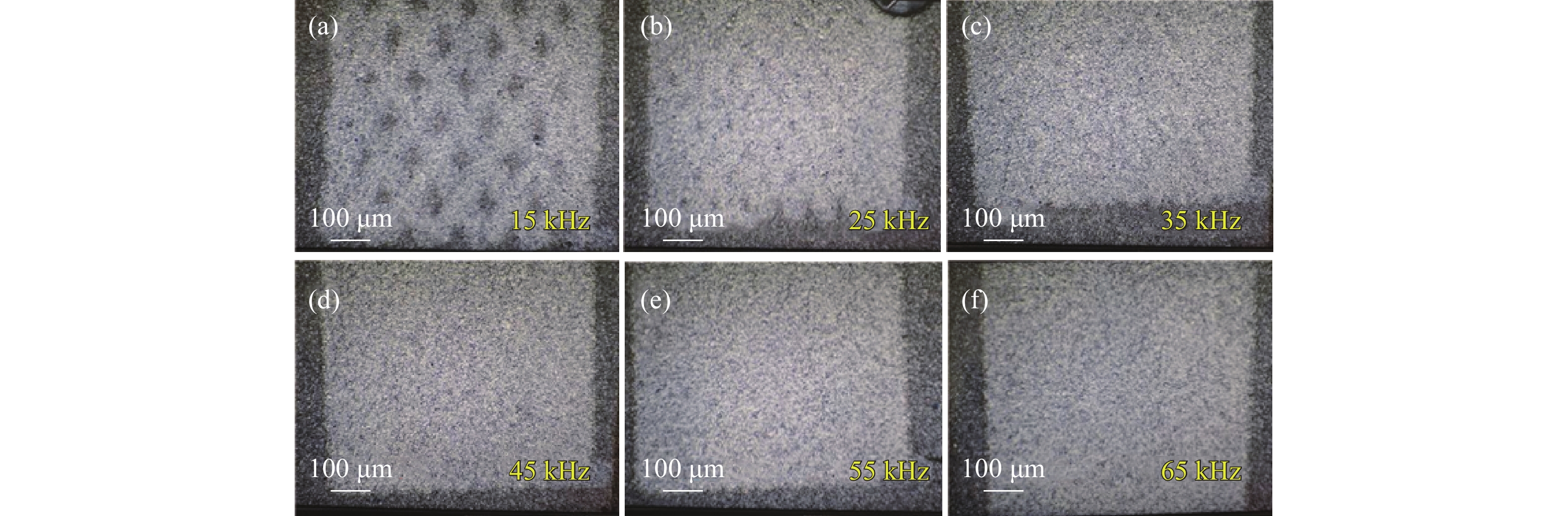 图 11 脉宽 200 ns和功率 175 W (35%),重复频率分别为 15 kHz、 25 kHz、 35 kHz、 45 kHz、 55 kHz、 65 kHz激光清洗显微镜样貌图
