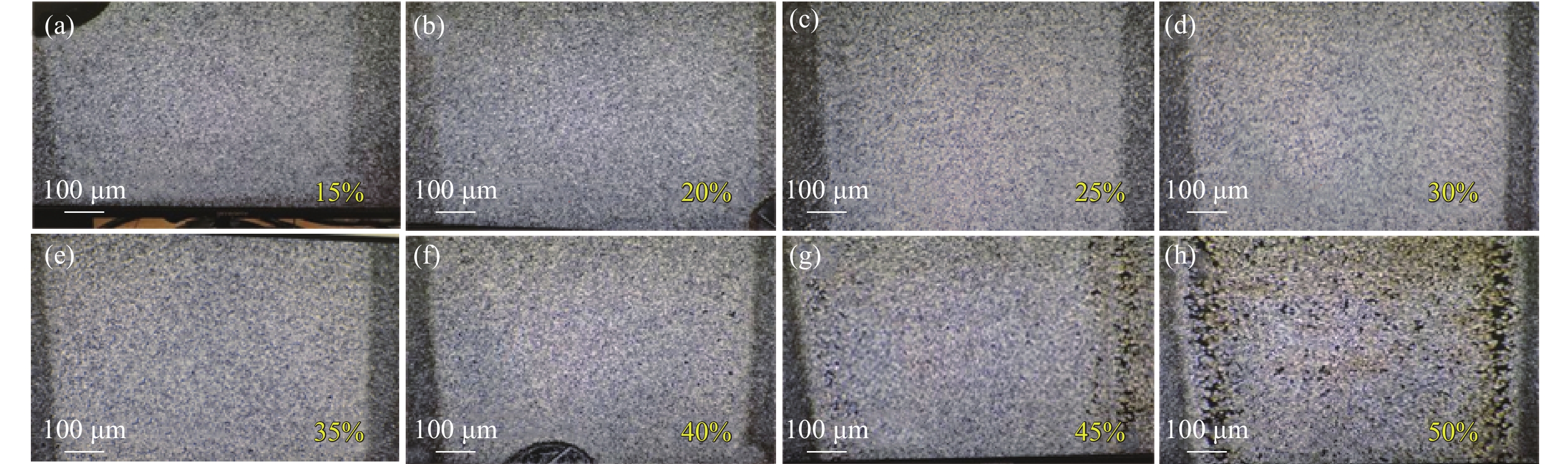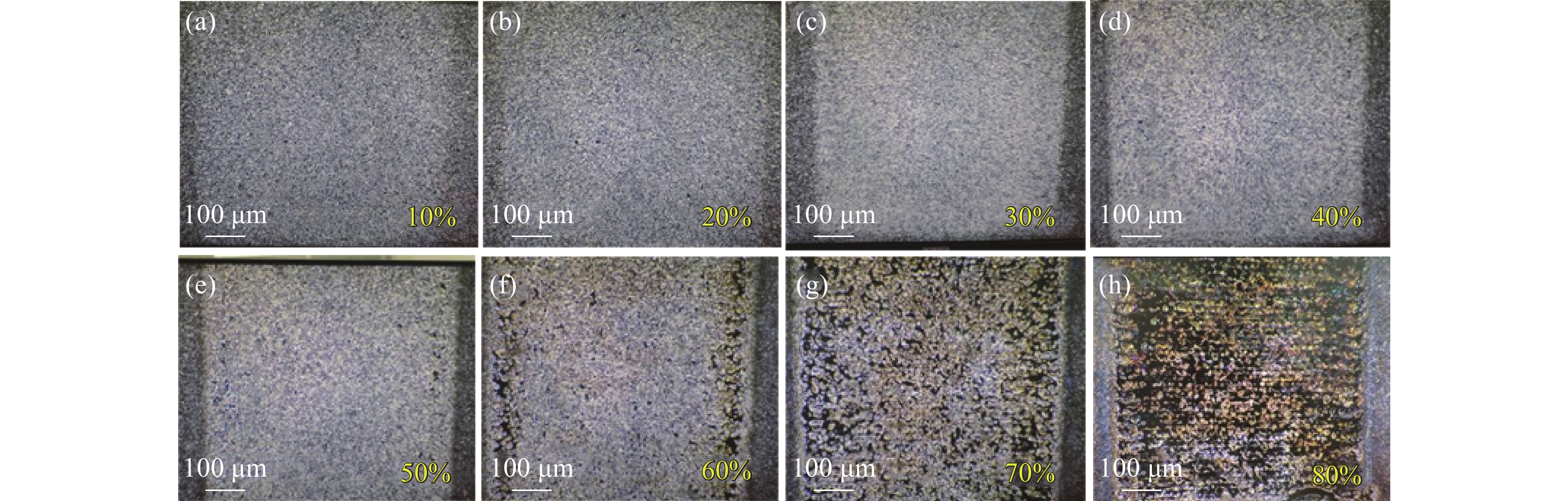 图 7 脉宽200 ns 和重频45 kHz时,功率分别为最大功率的(a) 15%、(b) 20%、(c) 25%、(d) 30%、(e) 35%、(f) 40%、(g) 45%、(h) 50%激光清洗显微镜样貌图