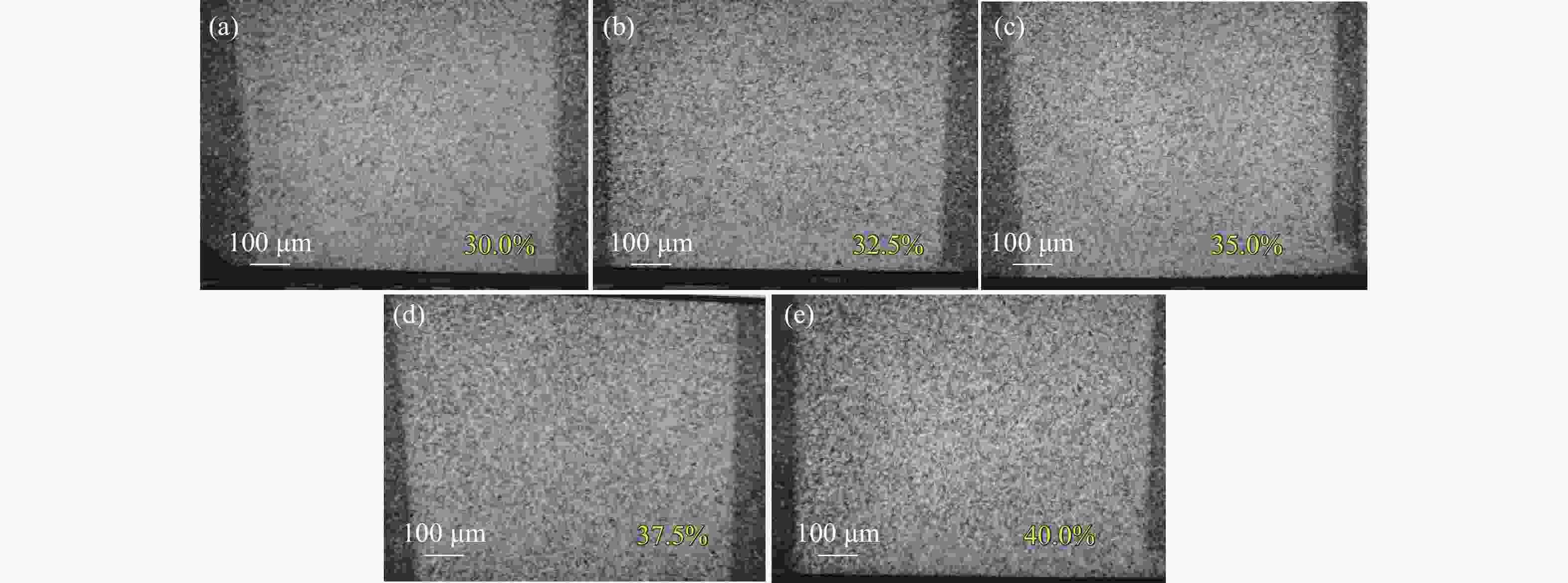 图 8 脉宽200 ns、重频45 kHz时,功率分别为最大功率的(a) 25%、(b) 27.5%、(c) 30%、(d) 32.5%、(e) 35%对应的激光清洗显微镜样貌