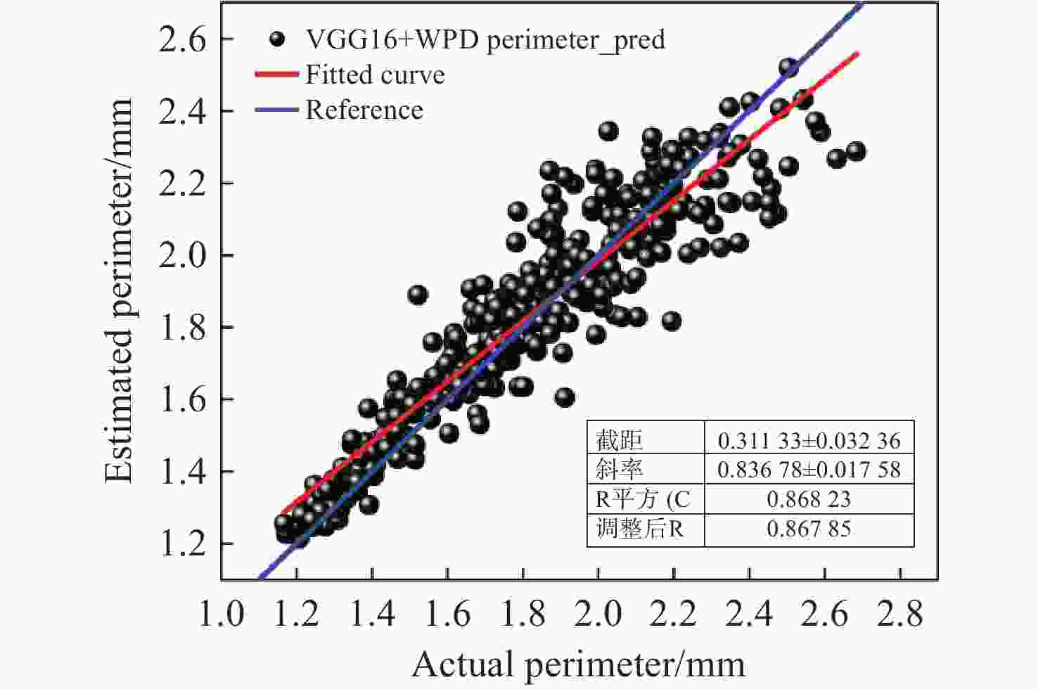 2160 张1 mm厚304不锈钢切割端面图像数据集。基于该数据集,采用高斯模糊、自适应阈值及形态学闭运算等图像处理算法,精确提取了挂渣的面积、高度及周长,将它们作为量化特征。为评估不同特征预测潜力,采用RGB图像及其经二值化处理小波包分解(WPD)频域图像作为输入,并系统对比了VGG16、ResNet50和DenseNet121三种CNN架构回归性能。结果表明,在RGB图像输入路径下,VGG16网络对挂渣面积和高度预测最为精准,其平均绝对误差(MAE)分别达到0.019 mm2和0.044 mm。而对于更能反映动态过程状态的轮廓周长特征,WPD频域输入路径的预测效果显著提升,MAE降至0.094 mm,归一化平均误差(nMAE)为5.25%,且其预测值与真实值间拟合斜率与决定系数R 2分别为0.83与0.86,呈现强线性关系。本研究证实,VGG16网络在熔渣特征预测中具备良好适用性,且WPD频域特征能更有效地捕捉激光切割过程瞬态信息,所提出方法可作为工艺智能评估与闭环优化的可靠量化工具。Abstract:To achieve precise quantification of laser cutting slag adhesion and process optimization, this study investigates a convolutional neural network (CNN)-based prediction method that integrates both image and frequency-domain features. A dataset of