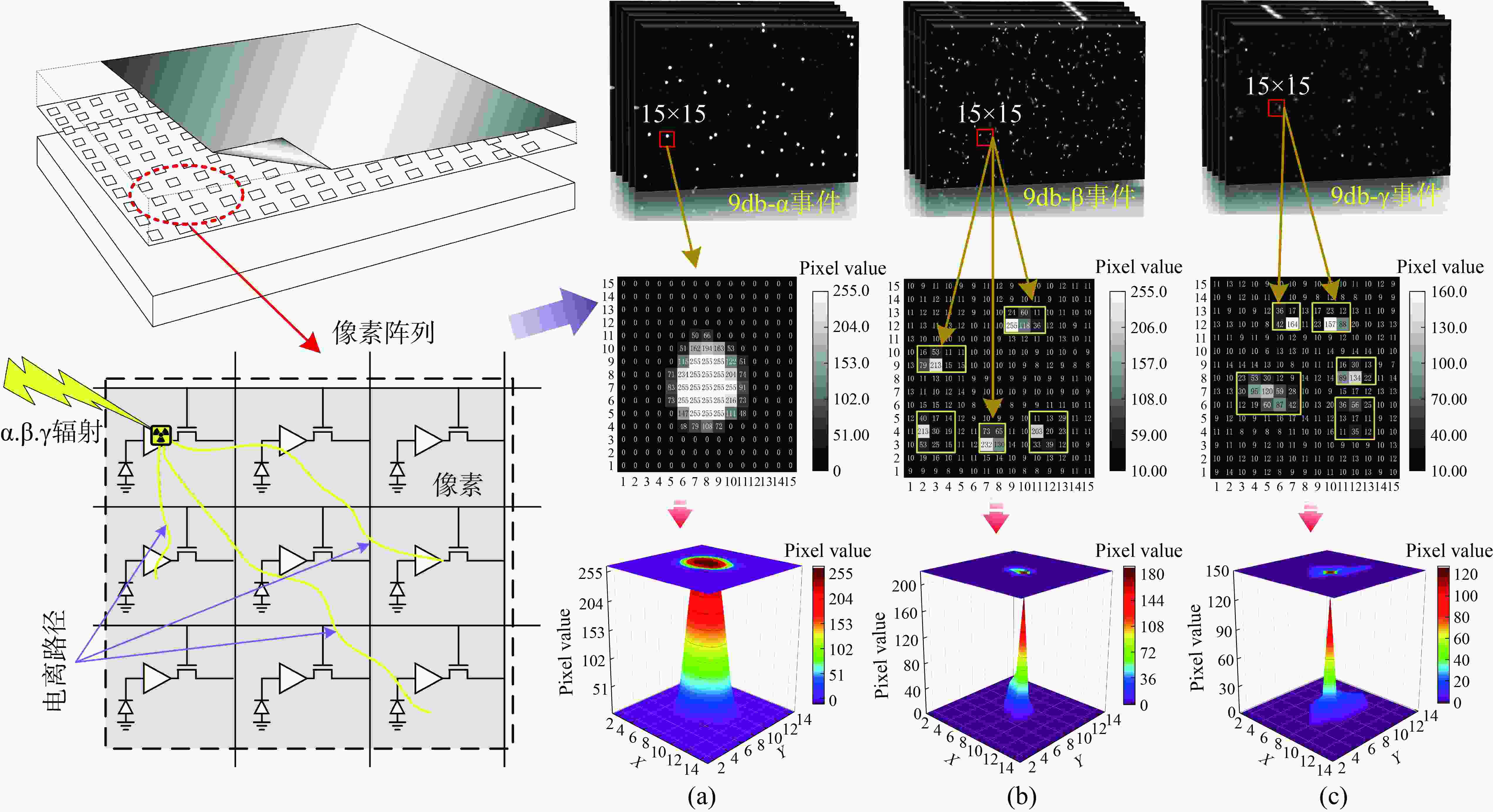 Abstract:To reduce pulse pile-up and improve ionizing particle discrimination efficiency, we use a CMOS active pixel sensor to analyze ionizing particle optical responses and propose morphology-based discrimination. By comparing the characteristics of response events of different ionizing particles, the regulatory mechanisms influenced by gain and integration time are elucidated, and the discrimination effectiveness is verified. Results show α events differ significantly from β and γ events in pixel count, mean pixel value, rectangularity, convexity, and compactness. β and γ events are similar in pixel count, rectangularity, and convexity, but differ in mean pixel value or compactness. Using pixel count, α events were identified with over 99% accuracy. β and γ events were discriminated by mean pixel value with over 82% accuracy. The results provide a new method and basis for ionizing particle identification in mixed radiation fields. It supports nuclear particle discrimination and noise mitigation, providing new approaches and theoretical guidance.