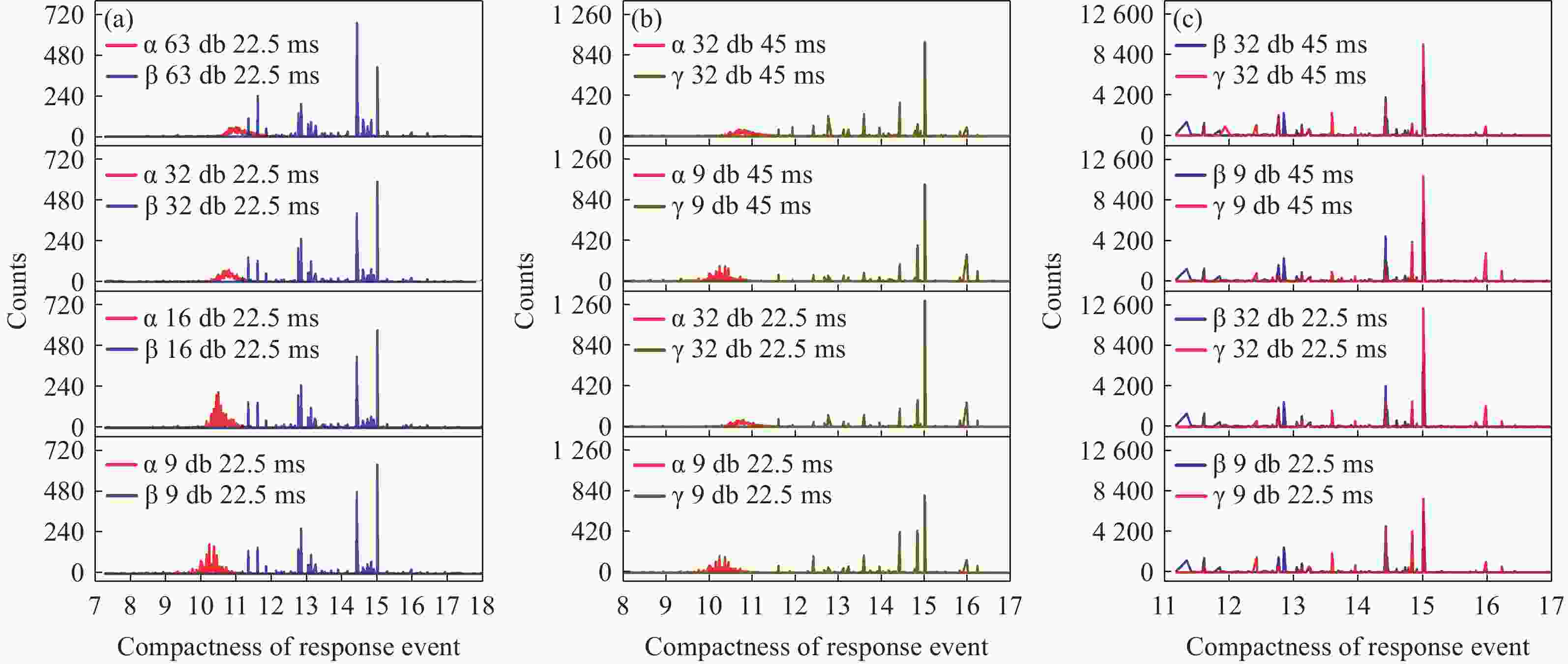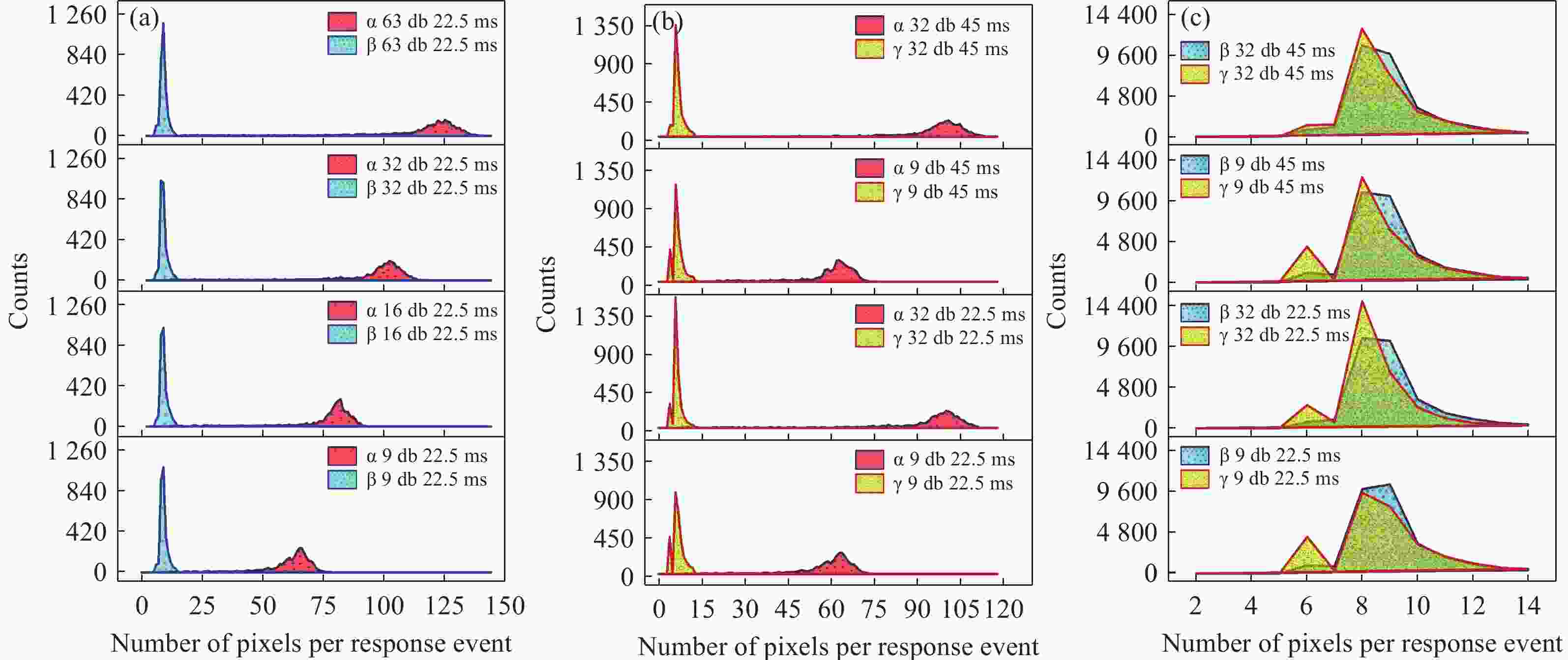实验样品参数 参数值 传感器像素尺寸 2.2 μm × 2.2 μm 传感器分辨率 2592 (水平) ×1944 (垂直)α 放射源活度 2.9× 104 Bq (241Am) β 放射源活度 7.4 × 107 Bq (63Ni) γ 放射源活度 9 × 1014 Bq (60Co) 表 2 响应事件的甄别效果