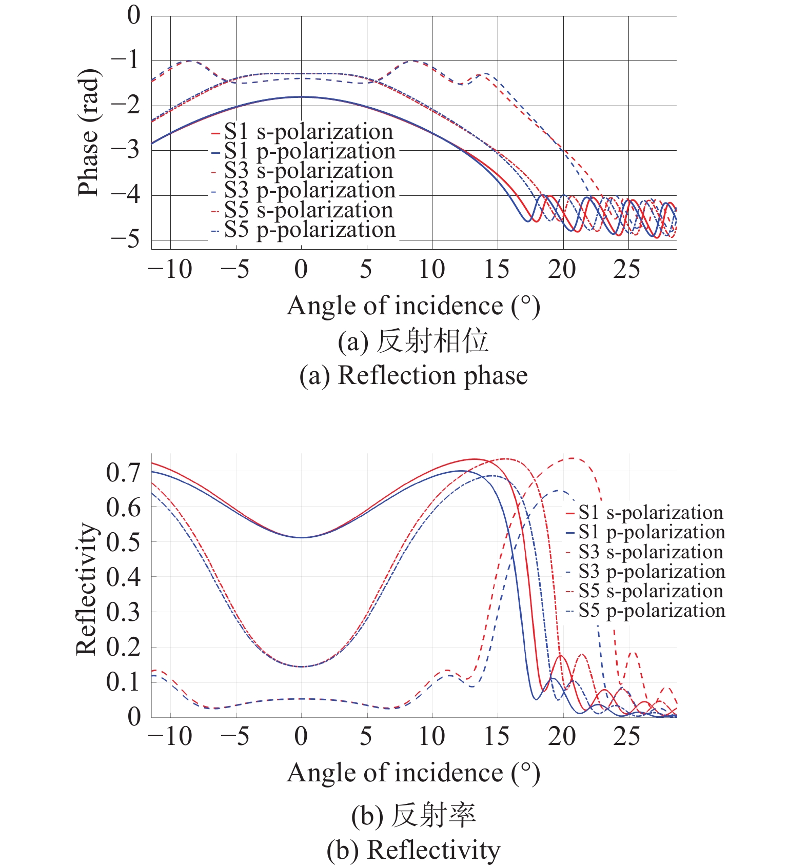 图 2  修正均匀膜层的反射相位和反射率随入射角的变化,实线、虚线和点划线分别表示表面1、3、5膜层反射特性