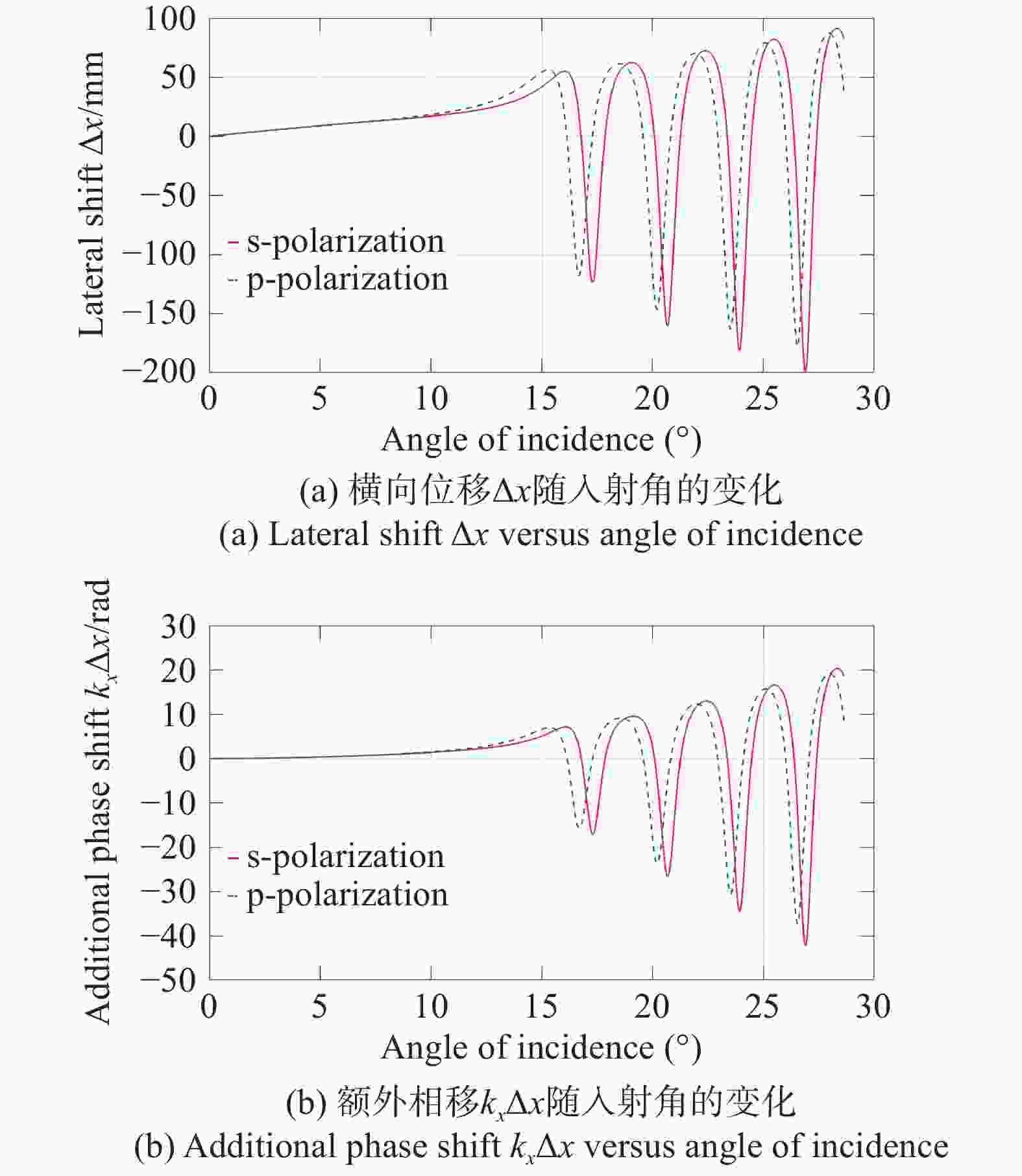 图 3  横向位移和额外相移随入射角的变化,入射角范围0~28°