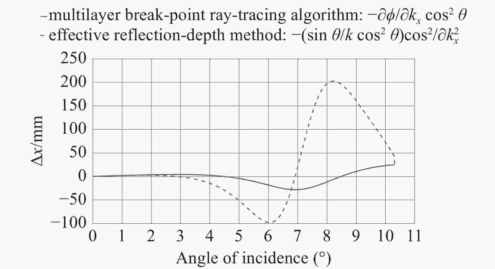 Figure 4.  Comparison of the lateral shift computed by the multilayer break-point ray-tracing method and the effective reflection-depth method; the two approaches agree well at small angles of incidence.