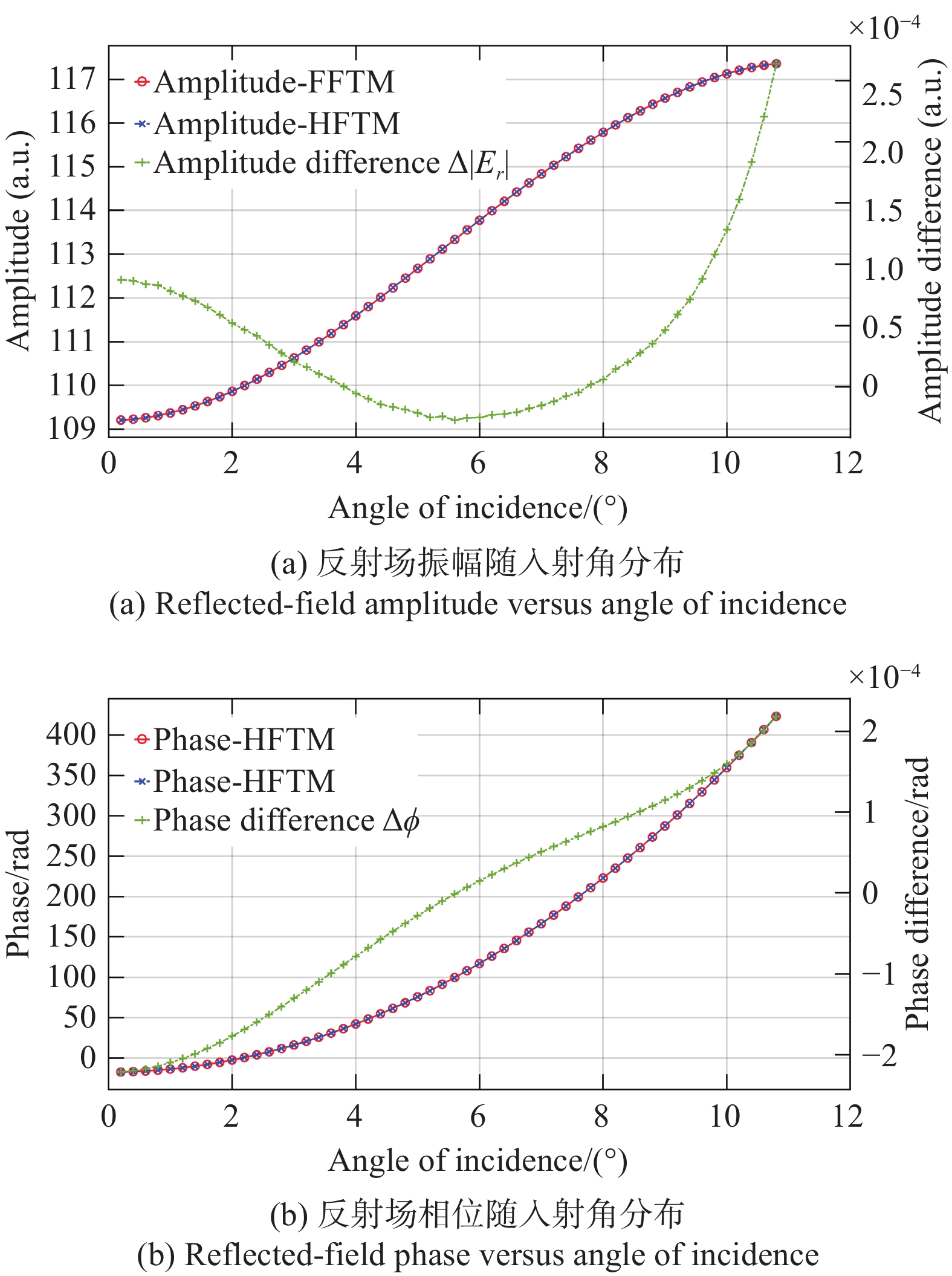 Figure 5.  Reflected-field amplitude and phase versus angle of incidence calculated using FFTM and the (HFTM): the amplitude/phase curves correspond to the left y-axis, and the difference curves correspond to the right y-axis.