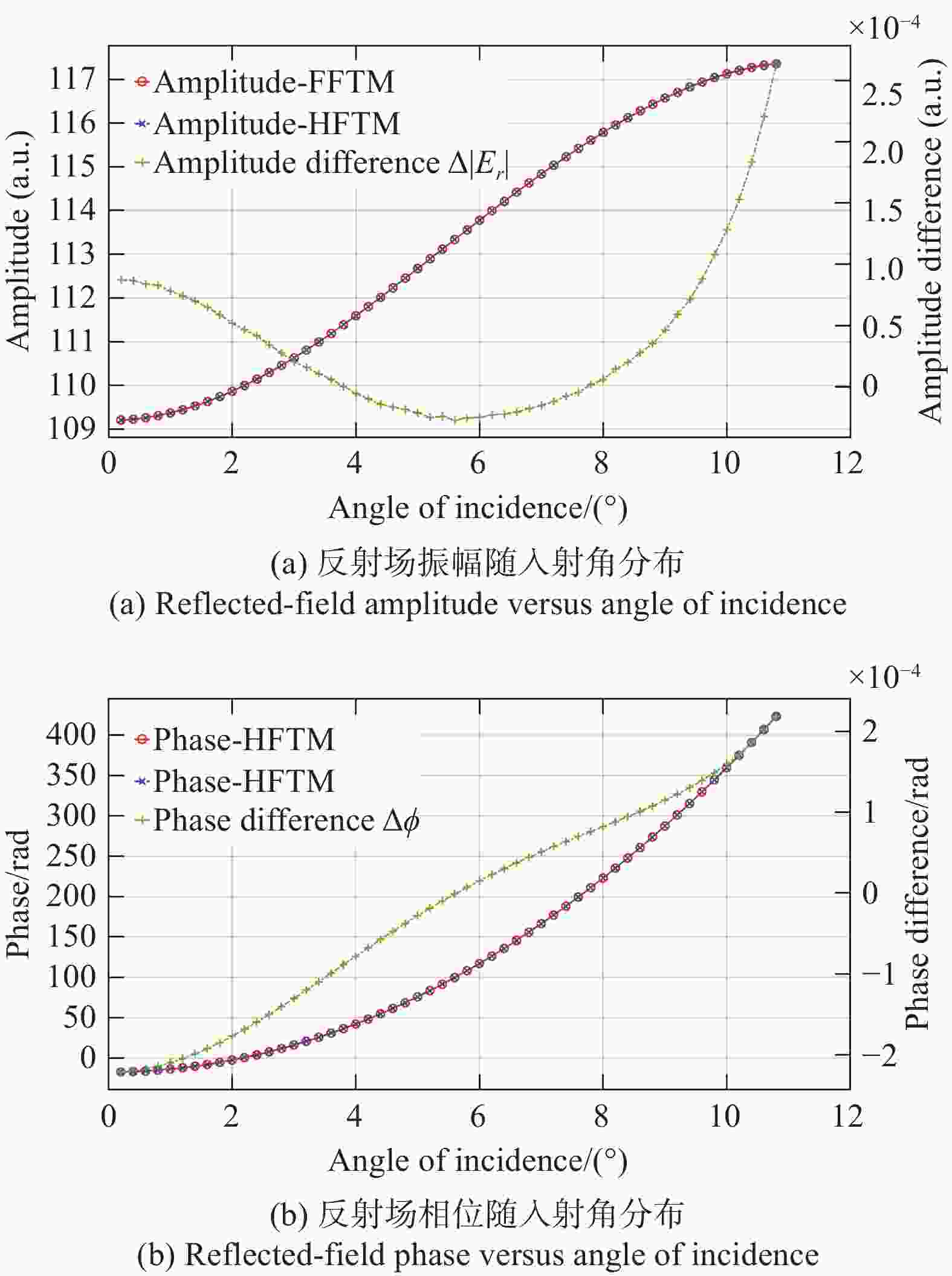 图 5  FFTM与HFTM计算的反射场振幅与相位随入射角分布,振幅、相位曲线对应左y轴,差值曲线对应右y轴