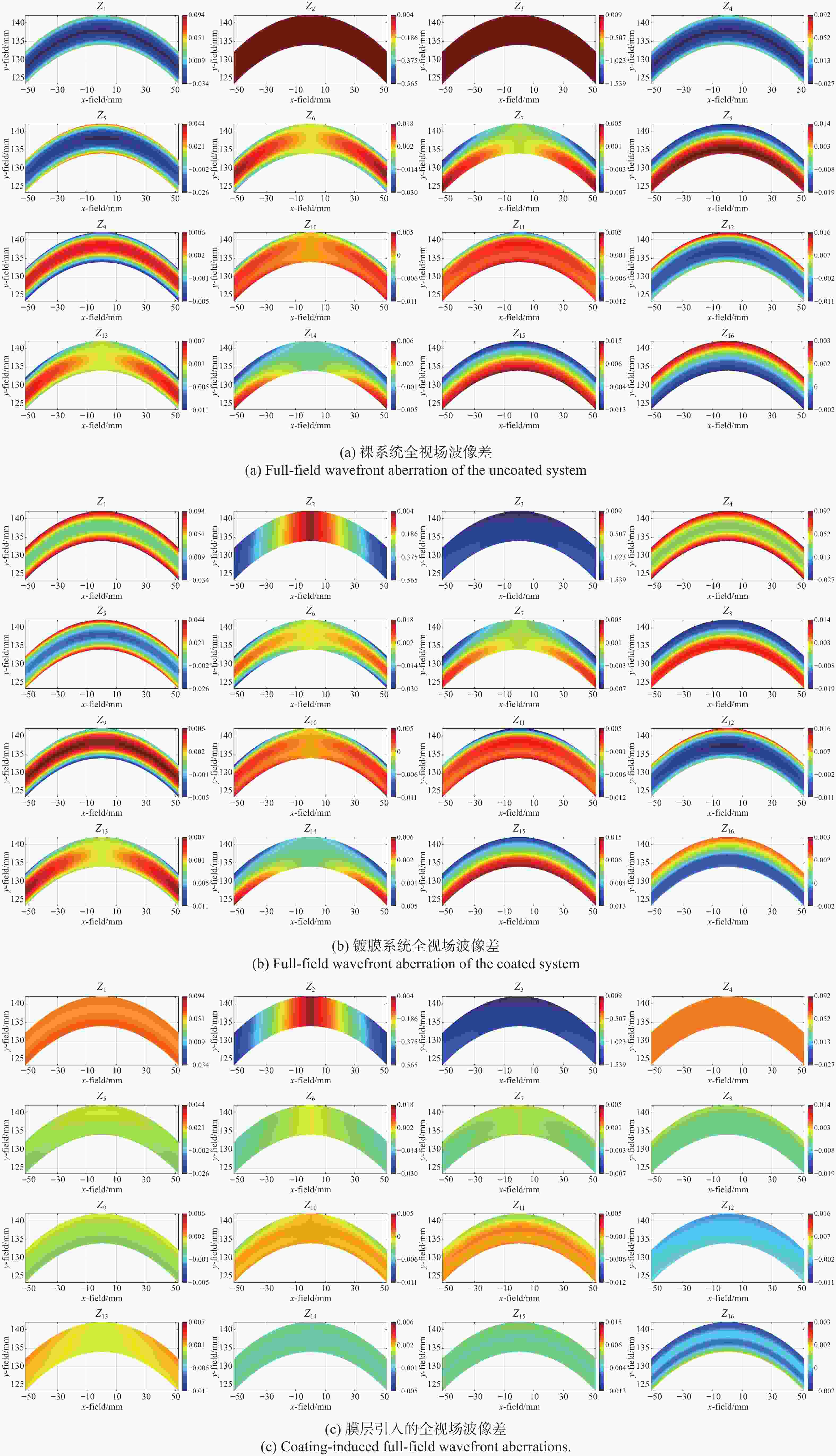 图 8  裸系统、镀膜系统及膜层引入波像差的前16项Zernike系数全视场分布,(a)、(b)、(c)中相同Zernike项绘制范围一致