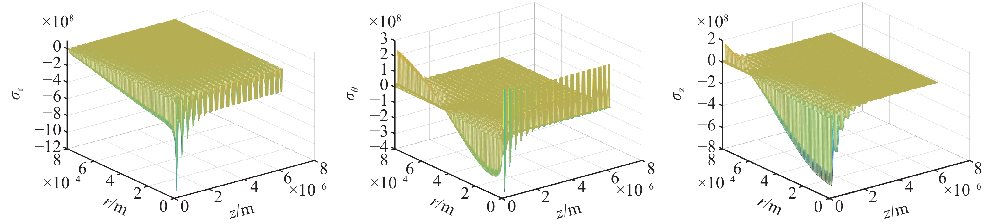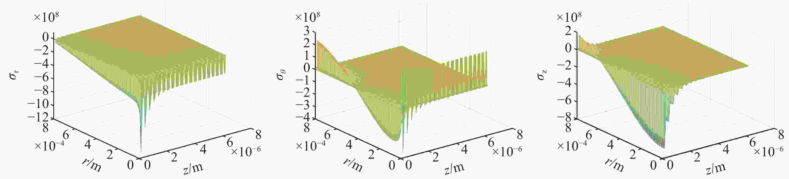 图 6  纳秒激光脉冲辐照下膜内热应力场分布。(a)径向应力;(b)环向应力;(c)轴向应力